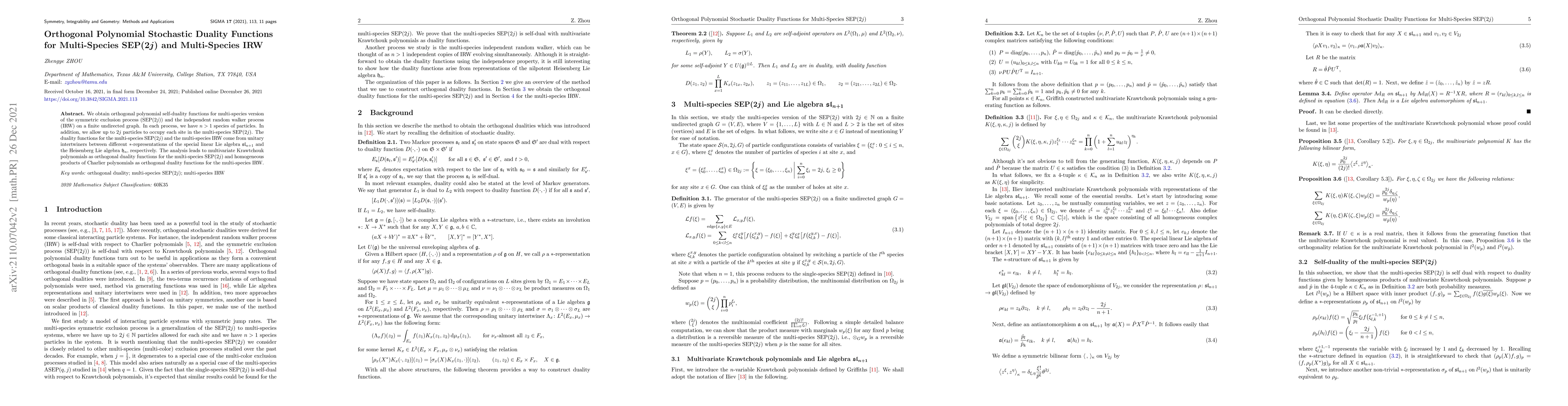 This paper derives orthogonal polynomial self-duality functions for multi-species versions of the symmetric exclusion process and independent random walker processes. It utilizes multivariate Krawtchouk polynomials for the SEP and homogeneous products of Charlier polynomials for the IRW, derived from unitary intertwiners of specific Lie algebras.