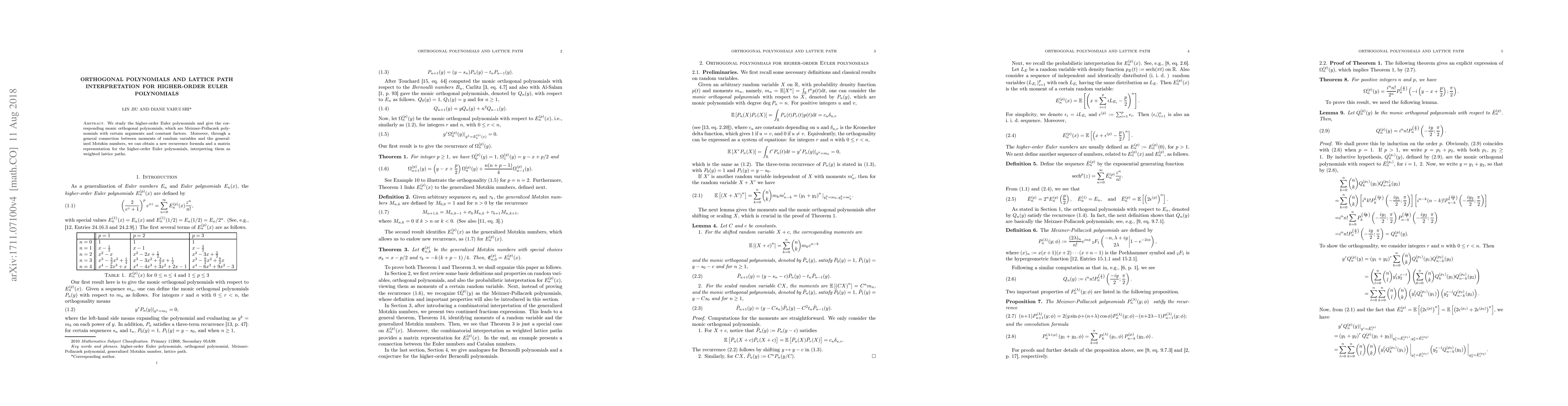 Summary: This paper explores higher-order Euler polynomials, connects them to Meixner-Pollaczek orthogonal polynomials, and provides a new recurrence formula and matrix representation through the interpretation of these polynomials as weighted lattice paths.