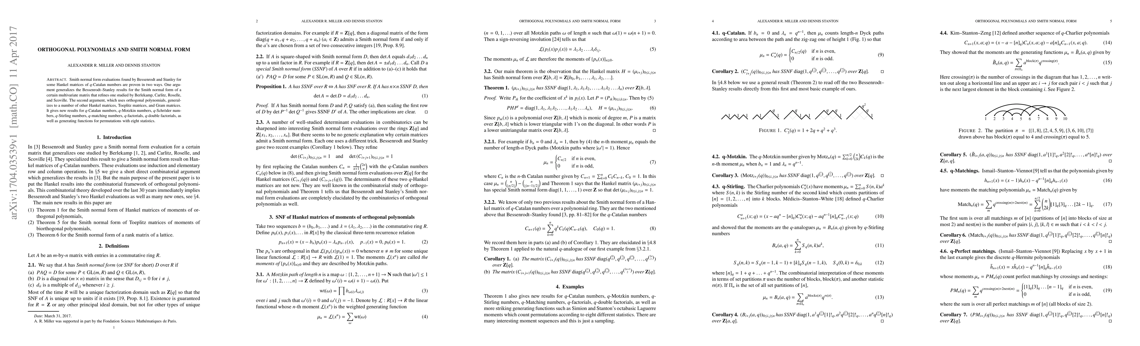 Smith normal form evaluations found by Bessenrodt and Stanley for some Hankel matrices of q-Catalan numbers are proven in two ways. One argument generalizes the Bessenrodt-Stanley results for the Smith normal form of a certain multivariate matrix that refines one studied by Berlekamp, Carlitz, Roselle, and Scoville. The second argument, which uses orthogonal polynomials, generalizes to a number of other Hankel matrices, Toeplitz matrices, and Gram matrices. It gives new results for q-Catalan numbers, q-Motzkin numbers, q-Schr\"oder numbers, q-Stirling numbers, q-matching numbers, q-factorials, q-double factorials, as well as generating functions for permutations with eight statistics.