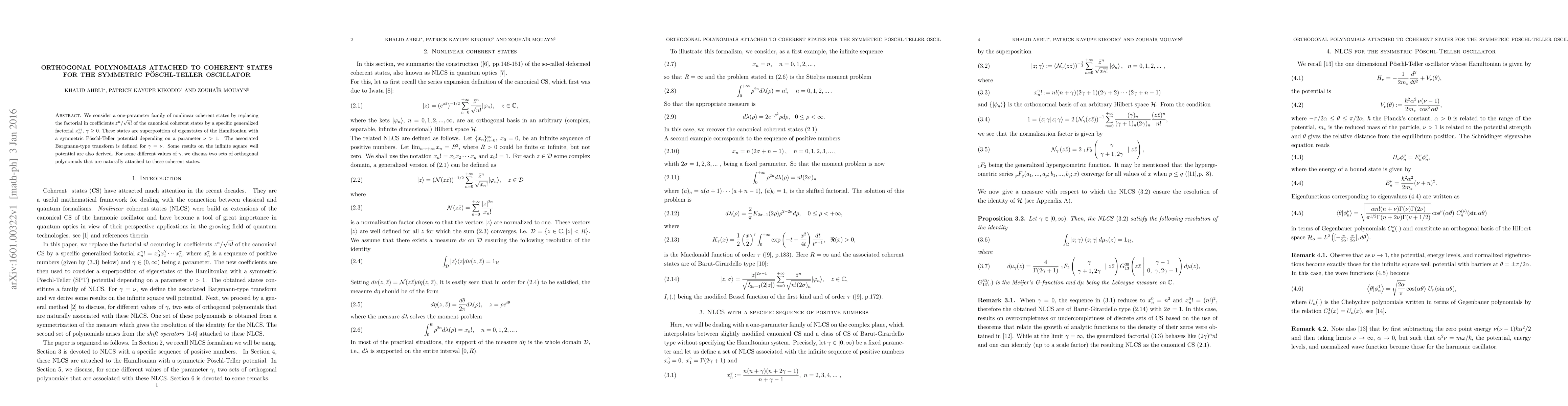 We consider a one-parameter family of nonlinear coherent states by replacing the factorial in coefficients of the canonical coherent states by a specific generalized factorial depending on a parameter gamma. These states are superposition of eigenstates of the Hamiltonian with a symmetric Poschl-Teller potential depending on a parameter nu > 1. The associated Bargmann-type transform is defined for equal parameters. Some results on the infinite square well potential are also derived. For some different values of gamma, we discuss two sets of orthogonal polynomials that are naturally attached to these coherent states.