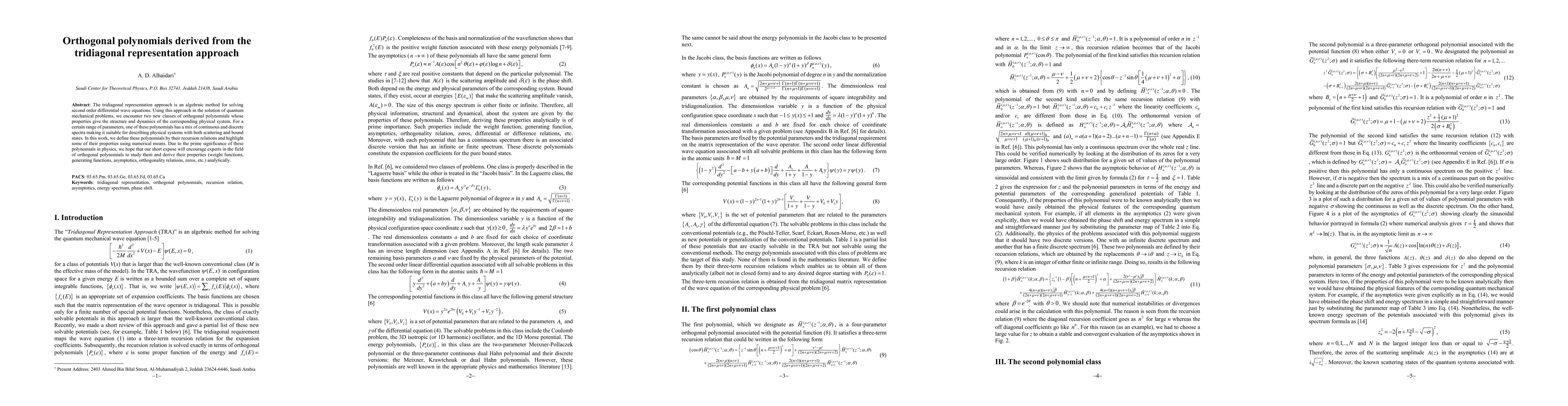 The tridiagonal representation approach is an algebraic method for solving second order differential wave equations. Using this approach in the solution of quantum mechanical problems, we encounter two new classes of orthogonal polynomials whose properties give the structure and dynamics of the corresponding physical system. For a certain range of parameters, one of these polynomials has a mix of continuous and discrete spectra making it suitable for describing physical systems with both scattering and bound states. In this work, we define these polynomials by their recursion relations and highlight some of their properties using numerical means. Due to the prime significance of these polynomials in physics, we hope that our short expose will encourage experts in the field of orthogonal polynomials to study them and derive their properties (weight functions, generating functions, asymptotics, orthogonality relations, zeros, etc.) analytically.