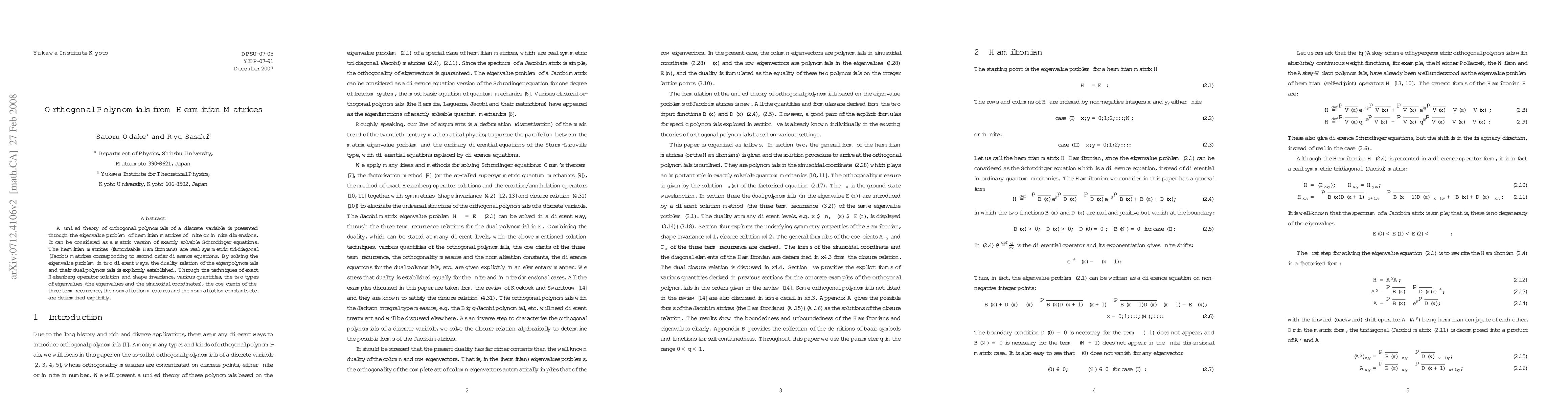This paper presents a unified theory of orthogonal polynomials via the eigenvalue problem of Hermitian matrices, establishing a matrix version of solvable Schrödinger equations. It explicitly determines various polynomial properties through exact solutions and shape invariance techniques.