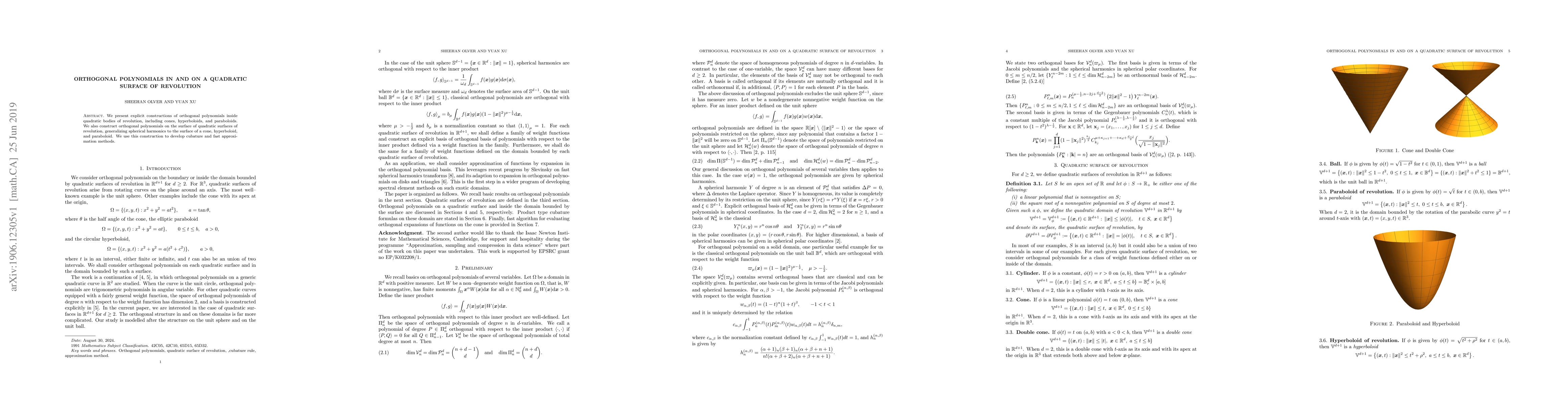 We present explicit constructions of orthogonal polynomials inside quadratic bodies of revolution, including cones, hyperboloids, and paraboloids. We also construct orthogonal polynomials on the surface of quadratic surfaces of revolution, generalizing spherical harmonics to the surface of a cone, hyperboloid, and paraboloid. We use this construction to develop cubature and fast approximation methods.