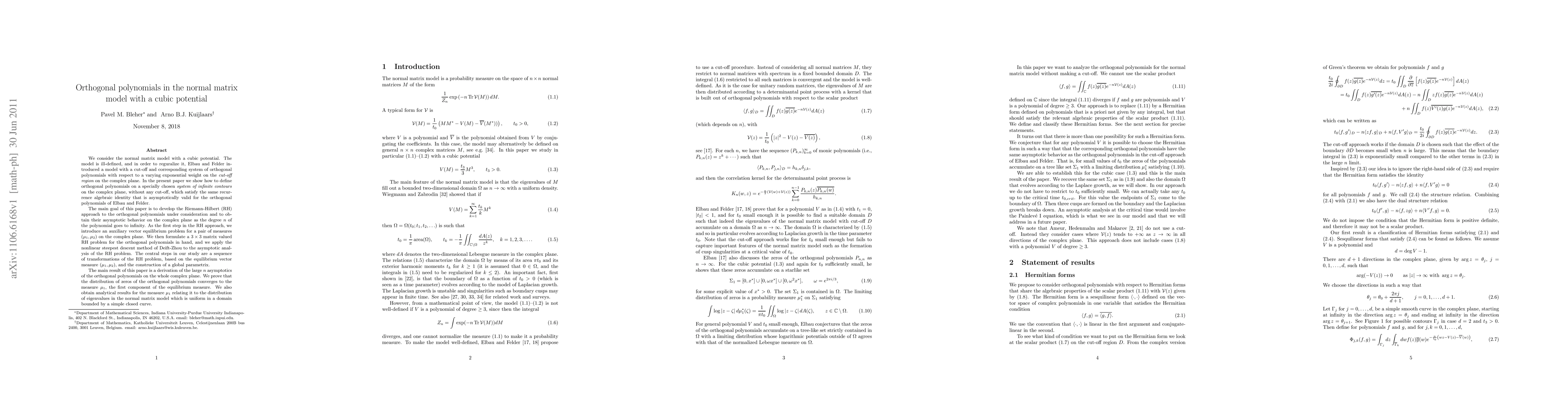 We consider the normal matrix model with a cubic potential. The model is ill-defined, and in order to reguralize it, Elbau and Felder introduced a model with a cut-off and corresponding system of orthogonal polynomials with respect to a varying exponential weight on the cut-off region on the complex plane. In the present paper we show how to define orthogonal polynomials on a specially chosen system of infinite contours on the complex plane, without any cut-off, which satisfy the same recurrence algebraic identity that is asymptotically valid for the orthogonal polynomials of Elbau and Felder. The main goal of this paper is to develop the Riemann-Hilbert (RH) approach to the orthogonal polynomials under consideration and to obtain their asymptotic behavior on the complex plane as the degree $n$ of the polynomial goes to infinity. As the first step in the RH approach, we introduce an auxiliary vector equilibrium problem for a pair of measures $(\mu_1,\mu_2)$ on the complex plane. We then formulate a $3\times 3$ matrix valued RH problem for the orthogonal polynomials in hand, and we apply the nonlinear steepest descent method of Deift-Zhou to the asymptotic analysis of the RH problem. The central steps in our study are a sequence of transformations of the RH problem, based on the equilibrium vector measure $(\mu_1,\mu_2)$, and the construction of a global parametrix. The main result of this paper is a derivation of the large $n$ asymptotics of the orthogonal polynomials on the whole complex plane. We prove that the distribution of zeros of the orthogonal polynomials converges to the measure $\mu_1$, the first component of the equilibrium measure. We also obtain analytical results for the measure $\mu_1$ relating it to the distribution of eigenvalues in the normal matrix model which is uniform in a domain bounded by a simple closed curve.