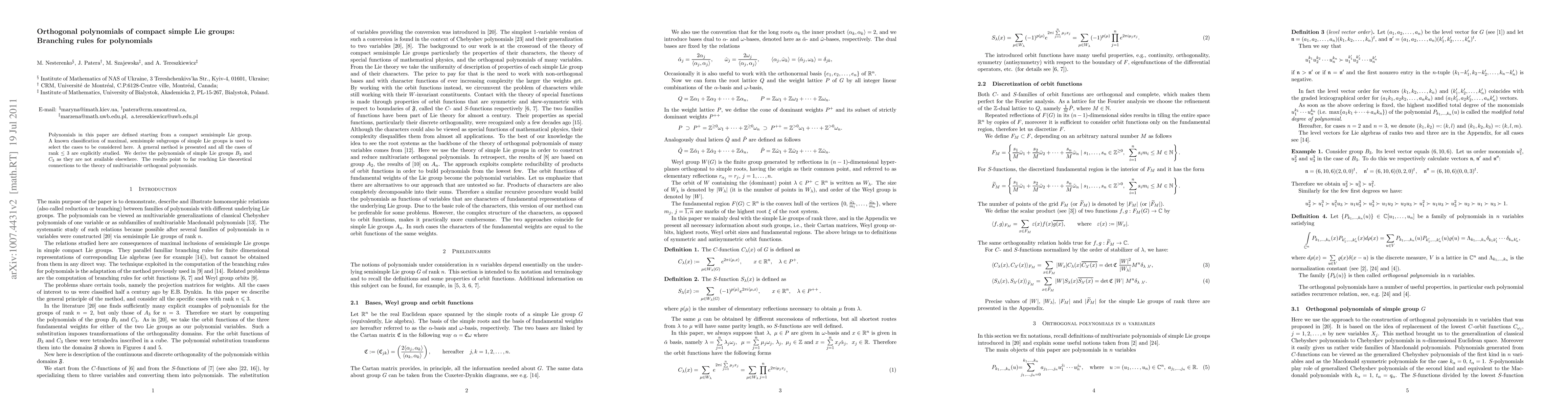 Polynomials in this paper are defined starting from a compact semisimple Lie group. A known classification of maximal, semisimple subgroups of simple Lie groups is used to select the cases to be considered here. A general method is presented and all the cases of rank not greater then 3 are explicitly studied. We derive the polynomials of simple Lie groups B_3 and C_3 as they are not available elsewhere. The results point to far reaching Lie theoretical connections to the theory of multivariable orthogonal polynomials.