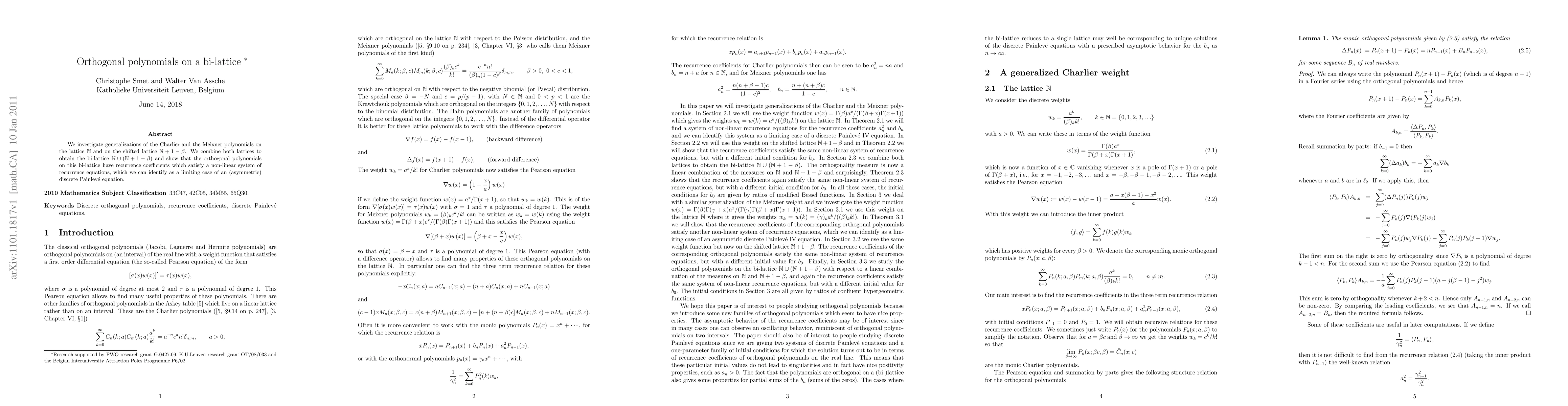 We investigate generalizations of the Charlier and the Meixner polynomials on the lattice N and on the shifted lattice N+1-\beta. We combine both lattices to obtain the bi-lattice N \cup (N+1-\beta) and show that the orthogonal polynomials on this bi-lattice have recurrence coefficients which satisfy a non-linear system of recurrence equations, which we can identify as a limiting case of an (asymmetric) discrete Painlev\'e equation.
