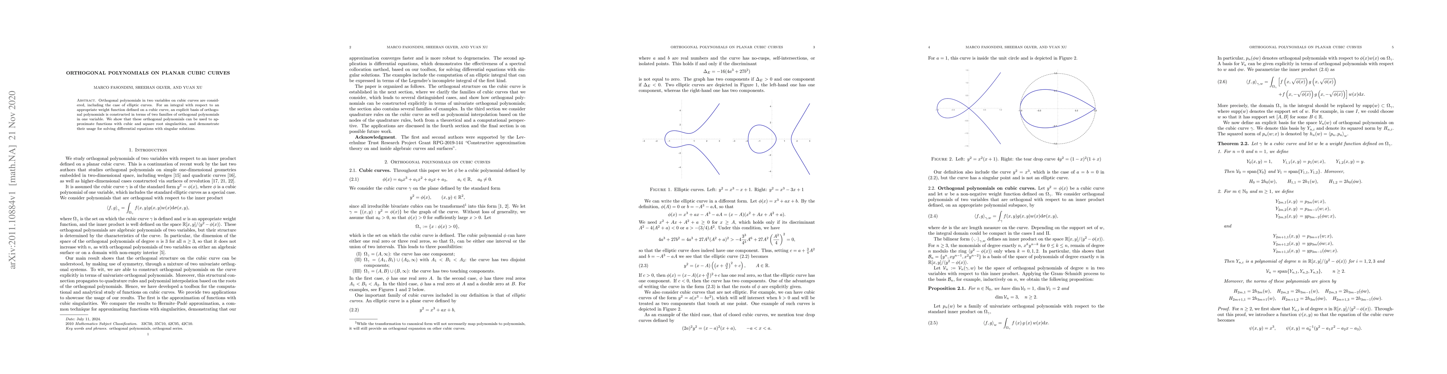 This paper constructs an explicit basis of orthogonal polynomials in two variables on planar cubic curves, including elliptic curves, and demonstrates their utility in approximating functions with singularities and solving differential equations with singular solutions. The approach leverages two families of orthogonal polynomials in one variable.