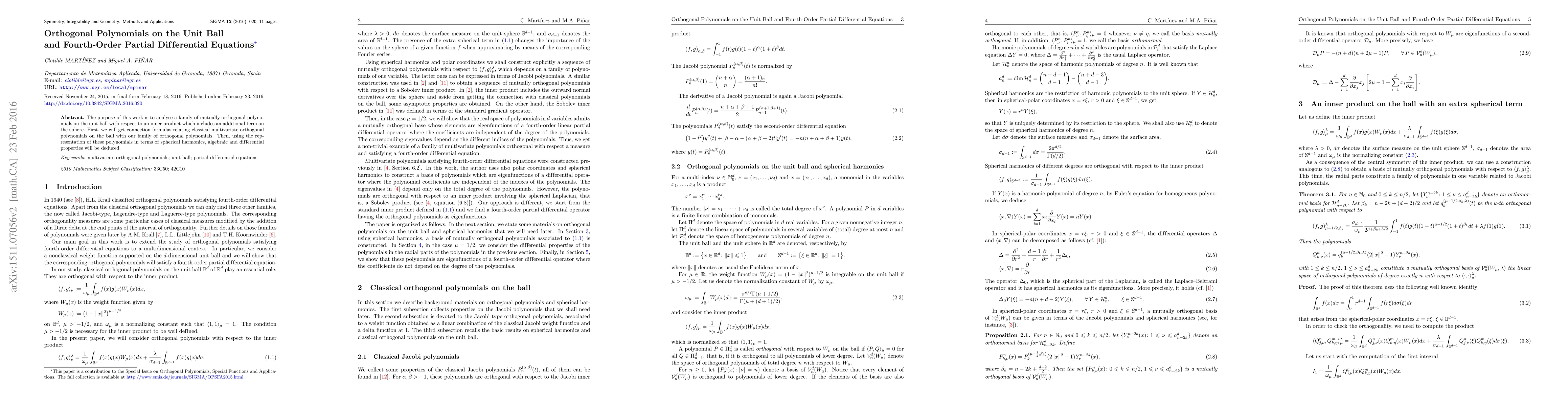 This paper analyzes a family of orthogonal polynomials on the unit ball, establishing connections to classical multivariate orthogonal polynomials and deriving algebraic and differential properties using spherical harmonics. The focus is on the inner product that includes an additional term on the sphere.