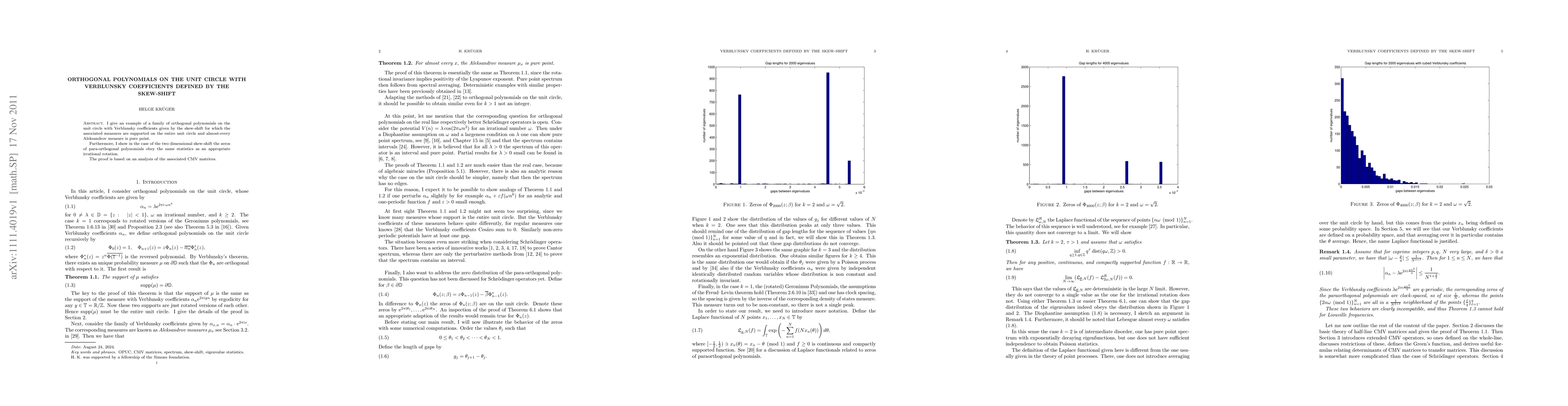 This paper presents a family of orthogonal polynomials on the unit circle where Verblunsky coefficients are defined by the skew-shift, showing that the associated measures are supported on the entire unit circle and exhibit pure point behavior. It also demonstrates that the zeros of para-orthogonal polynomials in the two-dimensional skew-shift follow the same statistical properties as an irrational rotation, with the proof relying on an analysis of CMV matrices.
