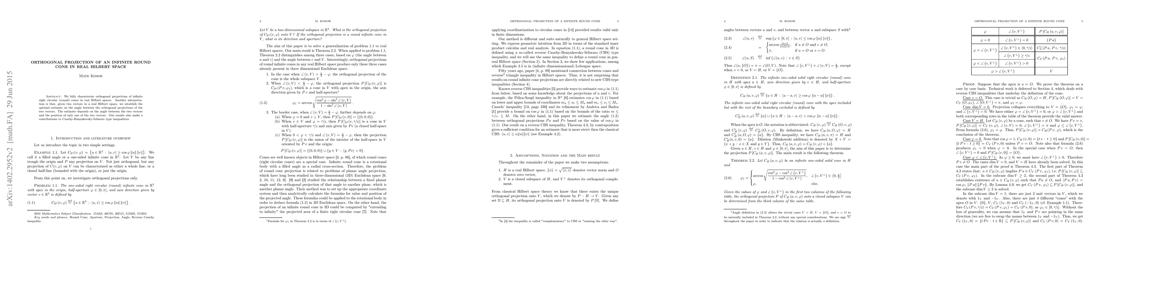 We fully characterize orthogonal projections of infinite right circular (round) cones in real Hilbert spaces. Another interpretation is that, given two vectors in a real Hilbert space, we establish the optimal estimate on the angle between the orthogonal projections of the two vectors. The estimate depends on the angle between the two vectors and the position of only one of the two vectors. Our results also make a contributions to Cauchy-Bunyakovsky-Schwarz type inequalities.