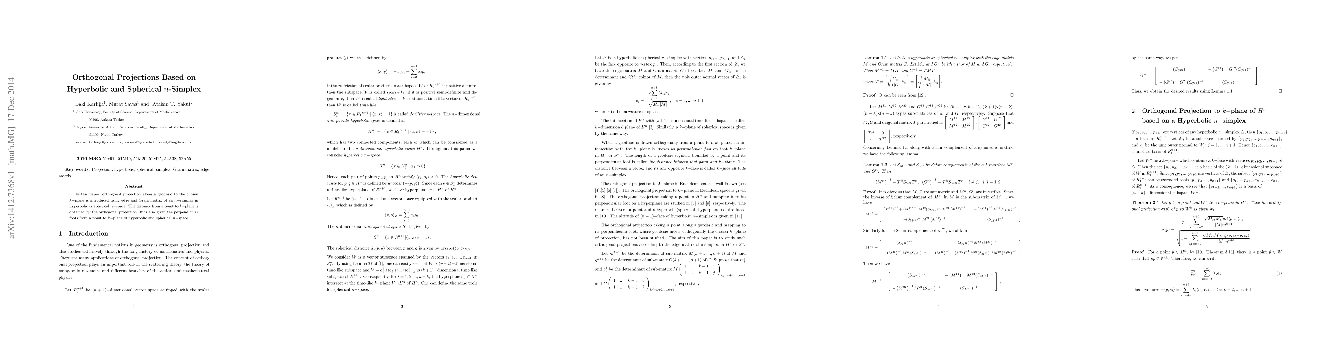 This paper introduces a method for orthogonal projection along geodesics to a k-plane in hyperbolic or spherical n-space using the edge and Gram matrix of an n-simplex, providing the distance and perpendicular foot from a point to the k-plane.