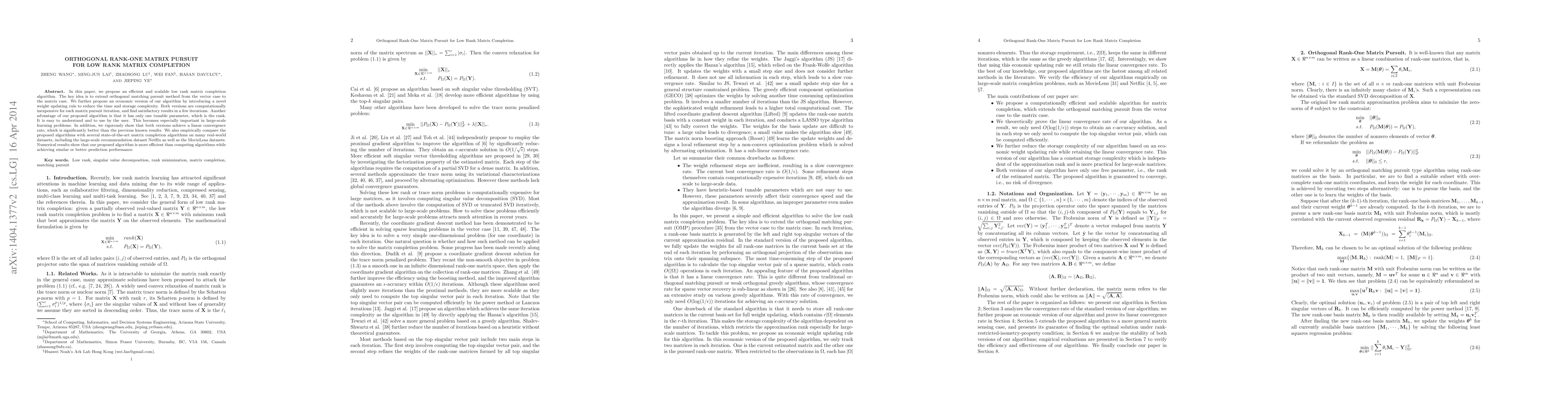 In this paper, we propose an efficient and scalable low rank matrix completion algorithm. The key idea is to extend orthogonal matching pursuit method from the vector case to the matrix case. We further propose an economic version of our algorithm by introducing a novel weight updating rule to reduce the time and storage complexity. Both versions are computationally inexpensive for each matrix pursuit iteration, and find satisfactory results in a few iterations. Another advantage of our proposed algorithm is that it has only one tunable parameter, which is the rank. It is easy to understand and to use by the user. This becomes especially important in large-scale learning problems. In addition, we rigorously show that both versions achieve a linear convergence rate, which is significantly better than the previous known results. We also empirically compare the proposed algorithms with several state-of-the-art matrix completion algorithms on many real-world datasets, including the large-scale recommendation dataset Netflix as well as the MovieLens datasets. Numerical results show that our proposed algorithm is more efficient than competing algorithms while achieving similar or better prediction performance.