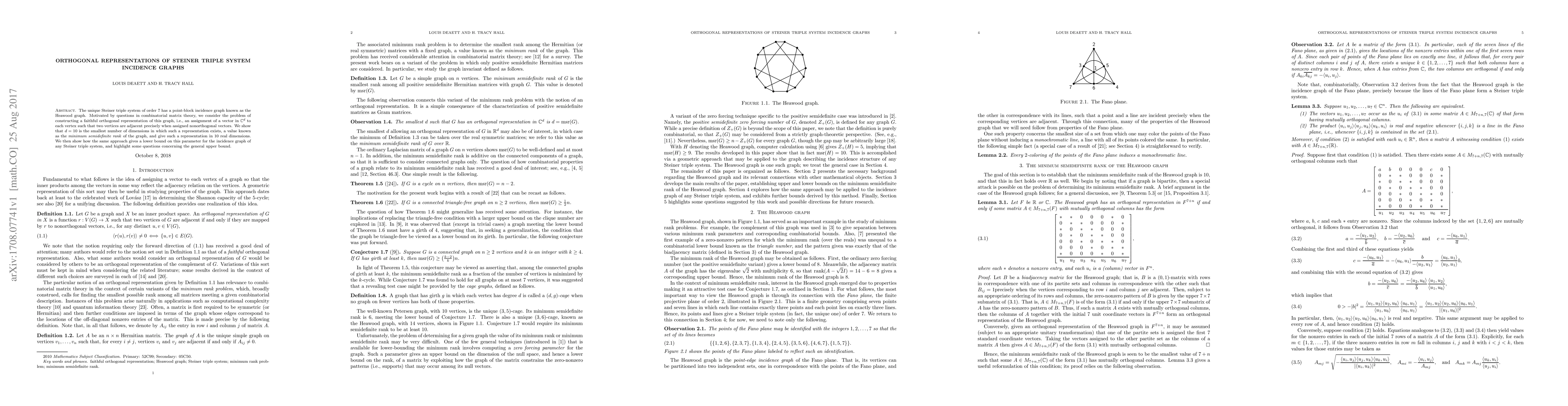This paper demonstrates that the Heawood graph, representing the Fano plane's incidence, has a minimum semidefinite rank of 10 for its orthogonal representation. Techniques used also apply to larger Steiner triple systems, with observations and questions posed for future research.