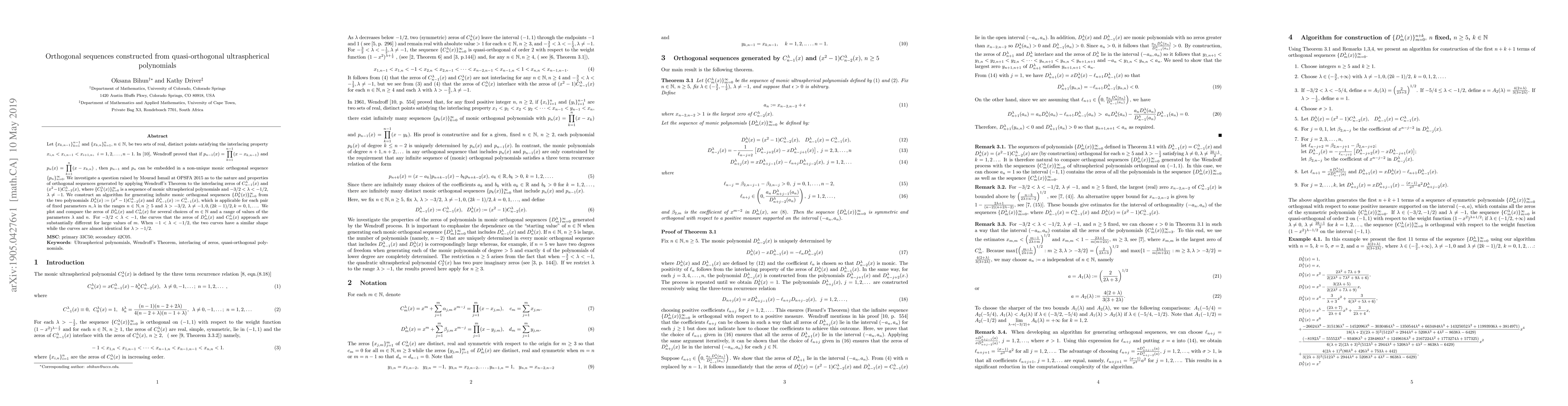 This paper presents an algorithm to generate infinite monic orthogonal sequences, D_k^λ(x), using ultraspherical polynomials C_k^λ(x) with interlacing zeros. The method is applicable for specific ranges of n and λ, showing distinct zero behaviors for different λ values, particularly for -3/2 < λ < -1 and -1 < λ < -1/2.