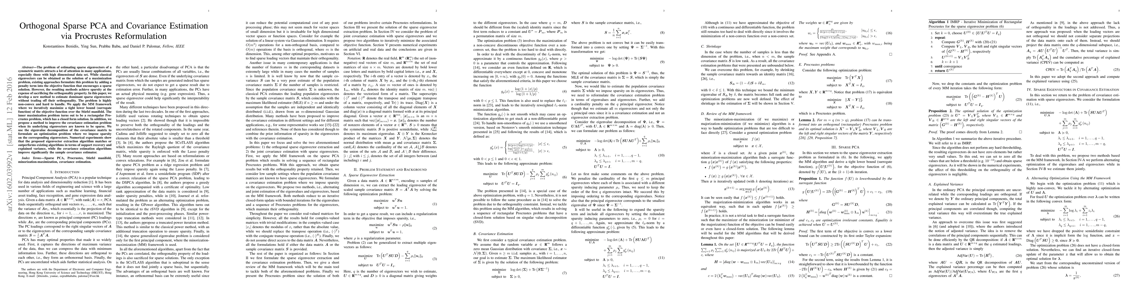 The problem of estimating sparse eigenvectors of a symmetric matrix attracts a lot of attention in many applications, especially those with high dimensional data set. While classical eigenvectors can be obtained as the solution of a maximization problem, existing approaches formulate this problem by adding a penalty term into the objective function that encourages a sparse solution. However, the resulting methods achieve sparsity at the expense of sacrificing the orthogonality property. In this paper, we develop a new method to estimate dominant sparse eigenvectors without trading off their orthogonality. The problem is highly non-convex and hard to handle. We apply the MM framework where we iteratively maximize a tight lower bound (surrogate function) of the objective function over the Stiefel manifold. The inner maximization problem turns out to be a rectangular Procrustes problem, which has a closed form solution. In addition, we propose a method to improve the covariance estimation problem when its underlying eigenvectors are known to be sparse. We use the eigenvalue decomposition of the covariance matrix to formulate an optimization problem where we impose sparsity on the corresponding eigenvectors. Numerical experiments show that the proposed eigenvector extraction algorithm matches or outperforms existing algorithms in terms of support recovery and explained variance, while the covariance estimation algorithms improve significantly the sample covariance estimator.