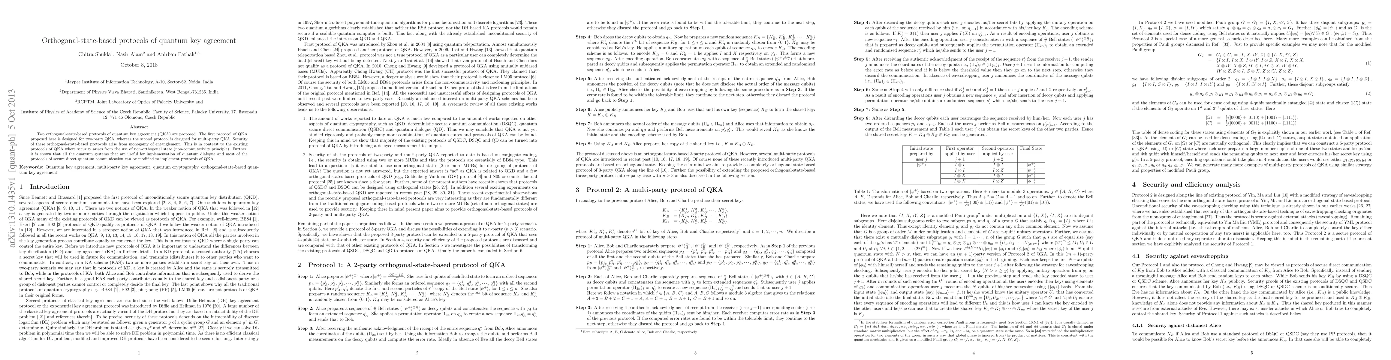 Two orthogonal-state-based protocols of quantum key agreement (QKA) are proposed. The first protocol of QKA proposed here is designed for two-party QKA, whereas the second protocol is designed for multi-party QKA. Security of these orthogonal-state-based protocols arise from monogamy of entanglement. This is in contrast to the existing protocols of QKA where security arises from the use of non-orthogonal state (non-commutativity principle). Further, it is shown that all the quantum systems that are useful for implementation of quantum dialogue and most of the protocols of secure direct quantum communication can be modified to implement protocols of QKA.