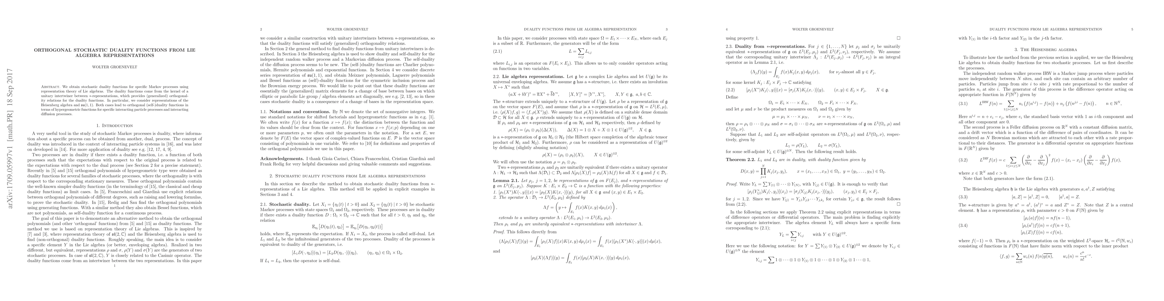 This paper derives stochastic duality functions for Markov processes via Lie algebra representations, particularly focusing on the Heisenberg algebra and $\mathfrak{su}(1,1)$. The functions exhibit orthogonality relations and are expressed in terms of hypergeometric functions for particle and diffusion processes.