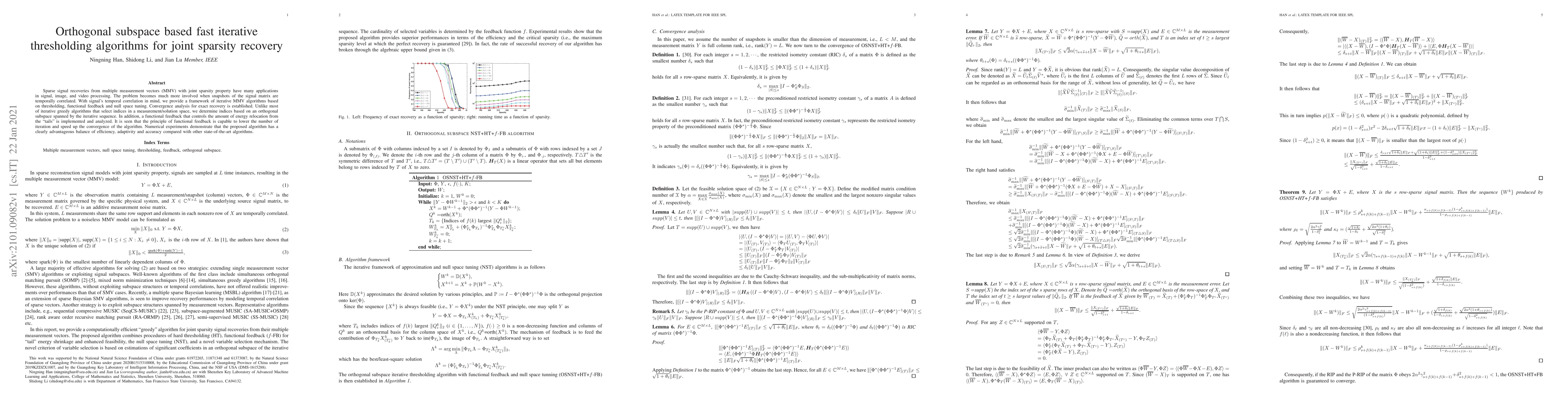 This paper proposes a fast iterative thresholding algorithm for joint sparsity recovery in MMV signals, utilizing an orthogonal subspace for index selection and functional feedback to enhance convergence. The method demonstrates superior efficiency, adaptivity, and accuracy compared to existing algorithms through numerical experiments.