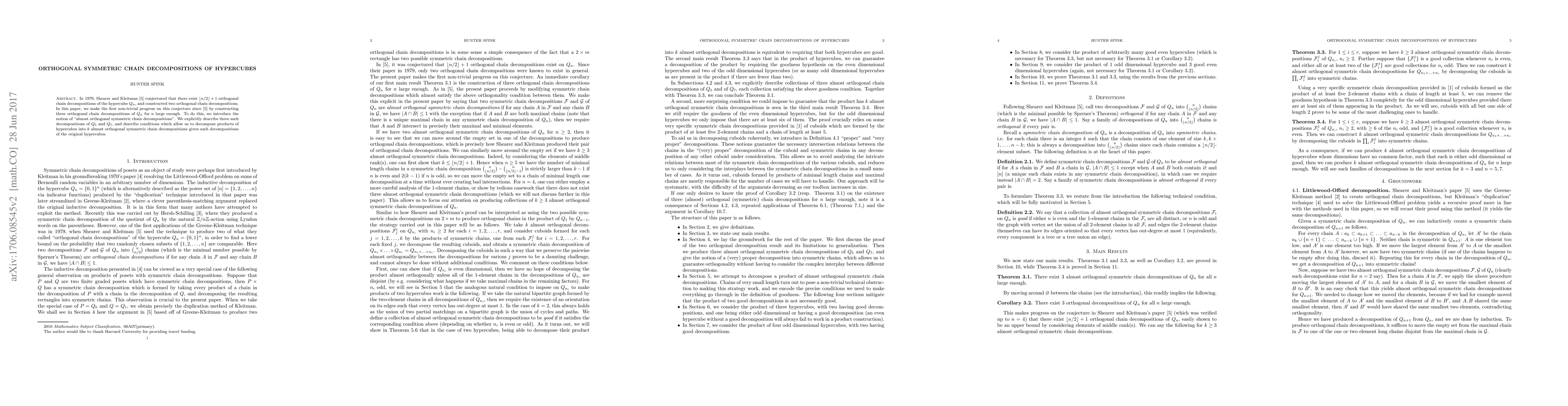 In 1979, Shearer and Kleitman conjectured that there exist $\lfloor n/2 \rfloor+1$ orthogonal chain decompositions of the hypercube $Q_n$, and constructed two orthogonal chain decompositions. In this paper, we make the first non-trivial progress on this conjecture since by constructing three orthogonal chain decompositions of $Q_n$ for $n$ large enough. To do this, we introduce the notion of "almost orthogonal symmetric chain decompositions". We explicitly describe three such decompositions of $Q_5$ and $Q_7$, and describe conditions which allow us to decompose products of hypercubes into $k$ almost orthogonal symmetric chain decompositions given such decompositions of the original hypercubes.