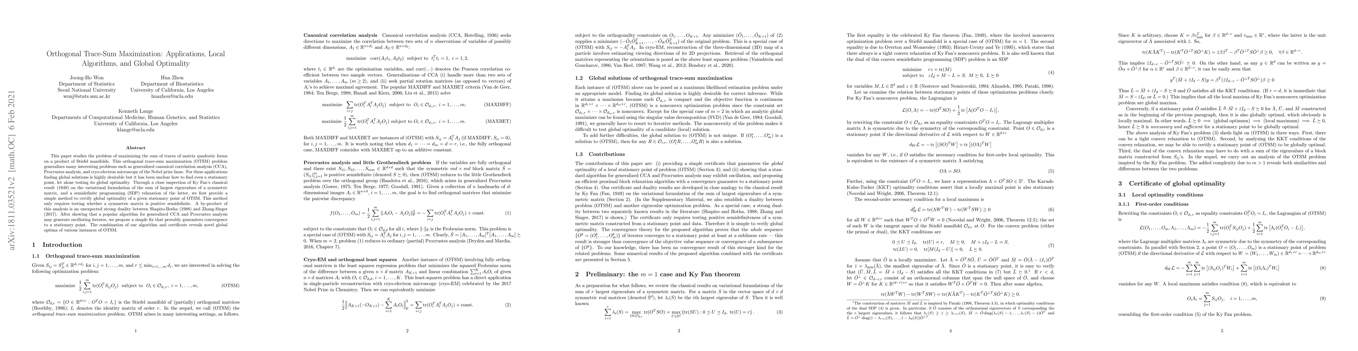 This paper studies the problem of maximizing the sum of traces of matrix quadratic forms on a product of Stiefel manifolds. This orthogonal trace-sum maximization (OTSM) problem generalizes many interesting problems such as generalized canonical correlation analysis (CCA), Procrustes analysis, and cryo-electron microscopy of the Nobel prize fame. For these applications finding global solutions is highly desirable but it has been unclear how to find even a stationary point, let alone testing its global optimality. Through a close inspection of Ky Fan's classical result (1949) on the variational formulation of the sum of largest eigenvalues of a symmetric matrix, and a semidefinite programming (SDP) relaxation of the latter, we first provide a simple method to certify global optimality of a given stationary point of OTSM. This method only requires testing whether a symmetric matrix is positive semidefinite. A by-product of this analysis is an unexpected strong duality between Shapiro-Botha (1988) and Zhang-Singer (2017). After showing that a popular algorithm for generalized CCA and Procrustes analysis may generate oscillating iterates, we propose a simple fix that provably guarantees convergence to a stationary point. The combination of our algorithm and certificate reveals novel global optima of various instances of OTSM.