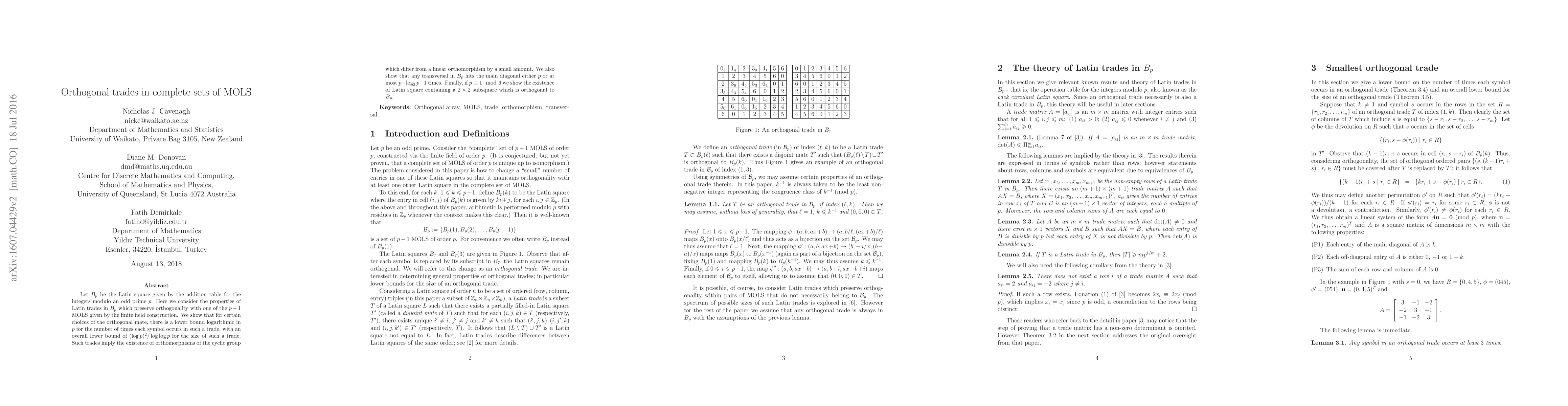 Let $B_p$ be the Latin square given by the addition table for the integers modulo an odd prime $p$. Here we consider the properties of Latin trades in $B_p$ which preserve orthogonality with one of the $p-1$ MOLS given by the finite field construction. We show that for certain choices of the orthogonal mate, there is a lower bound logarithmic in $p$ for the number of times each symbol occurs in such a trade, with an overall lower bound of $(\log{p})^2/\log\log{p}$ for the size of such a trade. Such trades imply the existence of orthomorphisms of the cyclic group which differ from a linear orthomorphism by a small amount. We also show that any transversal in $B_p$ hits the main diagonal either $p$ or at most $p-\log_2{p}-1$ times. Finally, if $p\equiv 1\mod{6}$ we show the existence of Latin square containing a $2\times 2$ subsquare which is orthogonal to $B_p$.