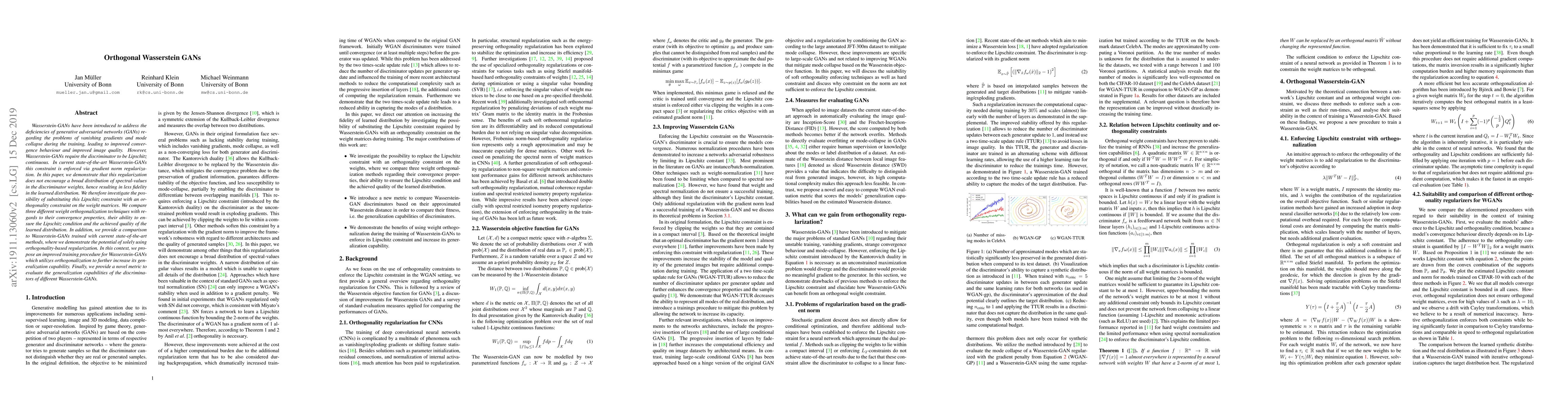 This paper proposes using orthogonality constraints instead of gradient norm regularization to enforce Lipschitz continuity in Wasserstein-GANs, aiming to improve the fidelity of the learned distribution. It evaluates various orthogonalization techniques and introduces a new training procedure and metric to assess the generalization capabilities of the discriminators.