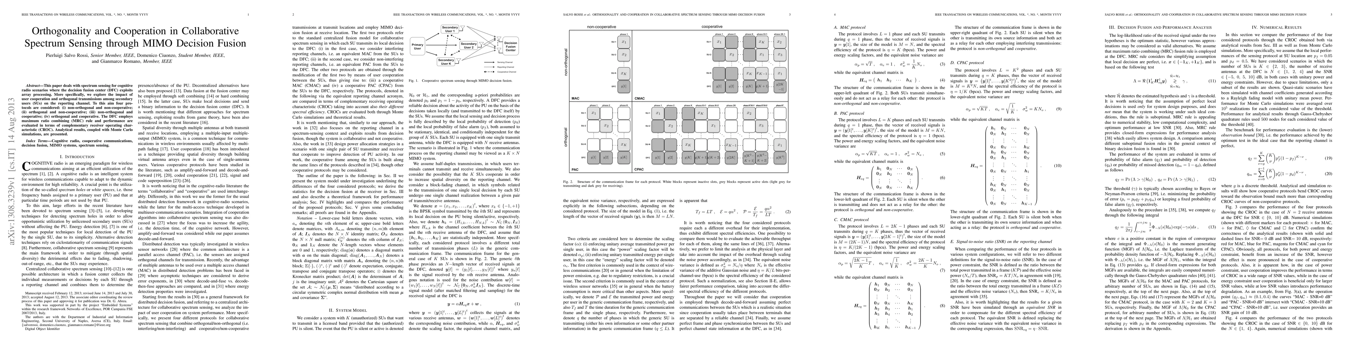 This paper investigates collaborative spectrum sensing in cognitive radio networks using MIMO decision fusion, focusing on the effects of user cooperation and orthogonal transmissions. Four protocols are analyzed, and performance is evaluated using the complementary receiver operating characteristic (CROC), with results supported by analytical and simulation studies.