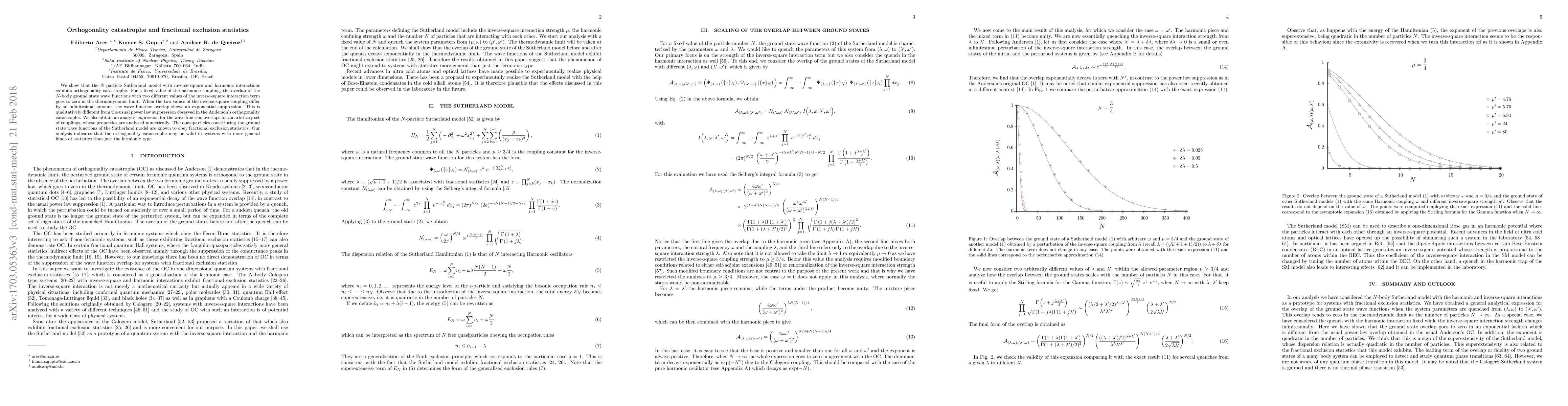 This paper investigates the Sutherland model's $N$-particle system, revealing an orthogonality catastrophe with exponential suppression in wave function overlaps under infinitesimal changes in inverse-square interaction. It also explores the model's fractional exclusion statistics, suggesting the phenomenon extends beyond fermionic systems.