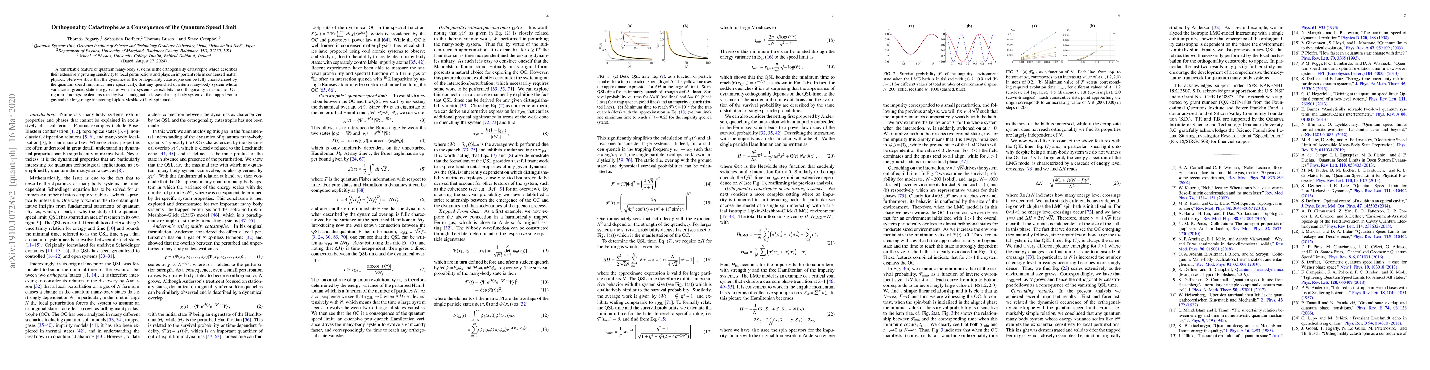 This paper demonstrates that the orthogonality catastrophe in quantum many-body systems, a sensitivity to local perturbations, is fully characterized by the quantum speed limit. It shows that systems with energy variance scaling with size exhibit this phenomenon, illustrated through trapped Fermi gas and Lipkin-Meshkov-Glick spin models.
