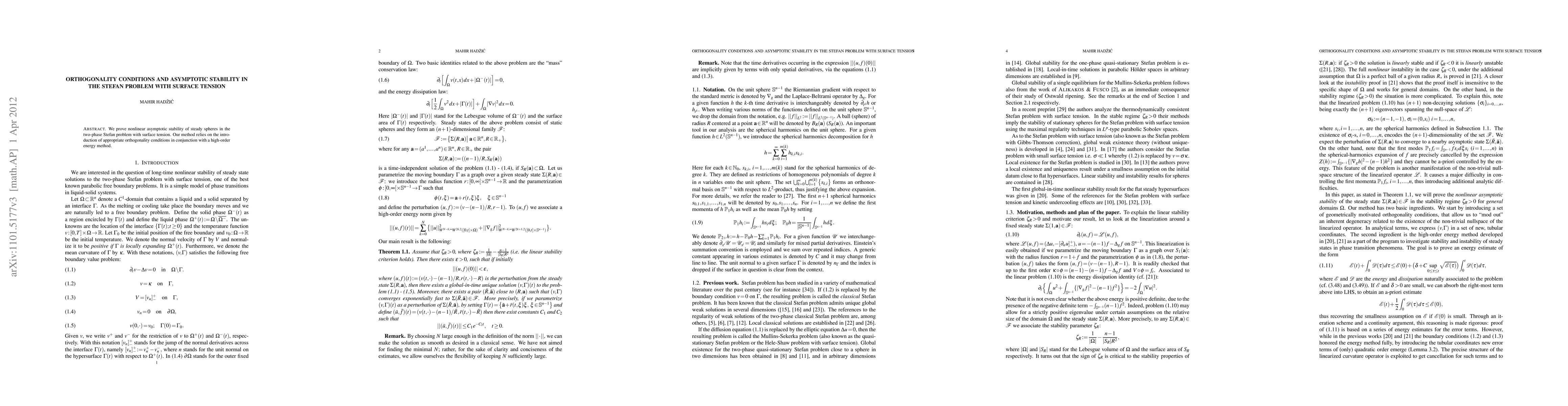 Summary: This paper proves the nonlinear asymptotic stability of steady spheres in the Stefan problem with surface tension, utilizing orthogonality conditions and a high-order energy method to achieve the result.