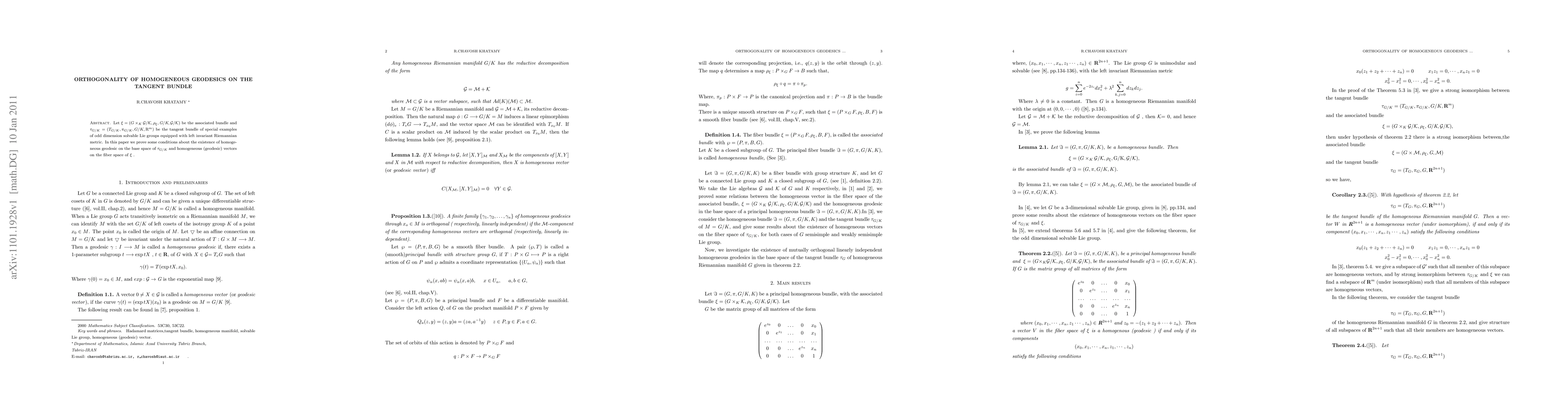 Let $\xi=(G\times_{K} \mathcal{G} / \mathcal{K}, \rho_{\xi}, \emph{G} / \emph{K},\mathcal{G} / \mathcal{K})$ be the associated bundle and $\tau_{G/K}=(T_{G/K},\pi_{G/K},G/K, \textrm{R}^{m})$ be the tangent bundle of special examples of odd dimension solvable Lie groups equipped with left invariant Riemannian metric. In this paper we prove some conditions about the existence of homogeneous geodesic on the base space of $\tau_{G/K}$ and homogeneous (geodesic) vectors on the fiber space of $\xi$ .