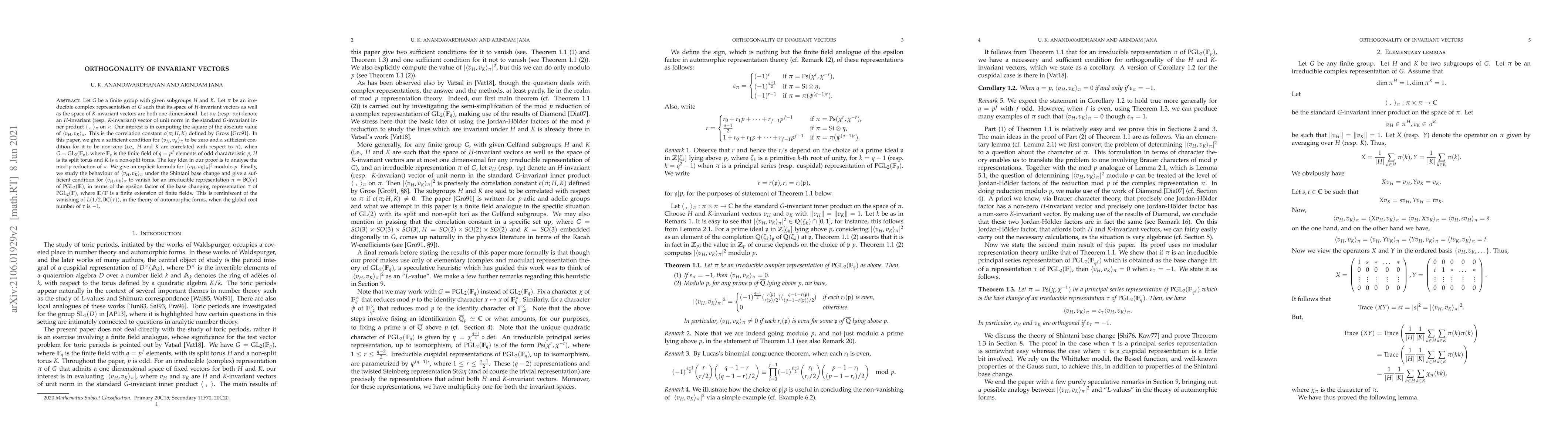 Let $G$ be a finite group with given subgroups $H$ and $K$. Let $\pi$ be an irreducible complex representation of $G$ such that its space of $H$-invariant vectors as well as the space of $K$-invariant vectors are both one dimensional. Let $v_H$ (resp. $v_K$) denote an $H$-invariant (resp. $K$-invariant) vector of unit norm in the standard $G$-invariant inner product $\langle ~,~ \rangle_\pi$ on $\pi$. Our interest is in computing the square of the absolute value of $\langle v_H,v_K \rangle_\pi$. This is the correlation constant $c(\pi;H,K)$ defined by Gross. In this paper, we give a sufficient condition for $\langle v_H, v_K \rangle_\pi$ to be zero and a sufficient condition for it to be non-zero (i.e., $H$ and $K$ are correlated with respect to $\pi$), when $G={\rm GL}_2(\mathbb F_q)$, where $\mathbb F_q$ is the finite field of $q=p^f$ elements of odd characteristic $p$, $H$ is its split torus and $K$ is a non-split torus. The key idea in our proof is to analyse the mod $p$ reduction of $\pi$. We give an explicit formula for $|\langle v_H,v_K \rangle_\pi|^2$ modulo $p$. Finally, we study the behaviour of $\langle v_H,v_K \rangle_\pi$ under the Shintani base change and give a sufficient condition for $\langle v_H,v_K \rangle_\pi$ to vanish for an irreducible representation $\pi={\rm BC}(\tau)$ of ${\rm PGL}_2(\mathbb E)$, in terms of the epsilon factor of the base changing representation $\tau$ of ${\rm PGL}_2(\mathbb F)$, where $\mathbb E/\mathbb F$ is a finite extension of finite fields. This is reminiscent of the vanishing of $L(1/2, {\rm BC}(\tau))$, in the theory of automorphic forms, when the global root number of $\tau$ is $-1$.