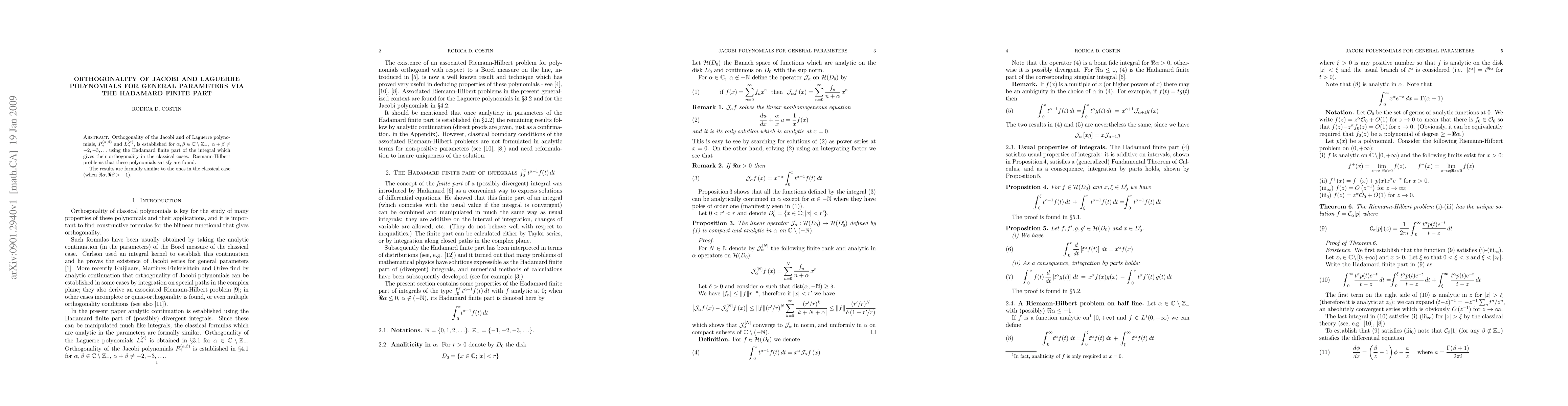 This paper establishes the orthogonality of Jacobi and Laguerre polynomials for complex parameters using the Hadamard finite part of the integral, extending classical results. The study also identifies the Riemann-Hilbert problems satisfied by these polynomials.
