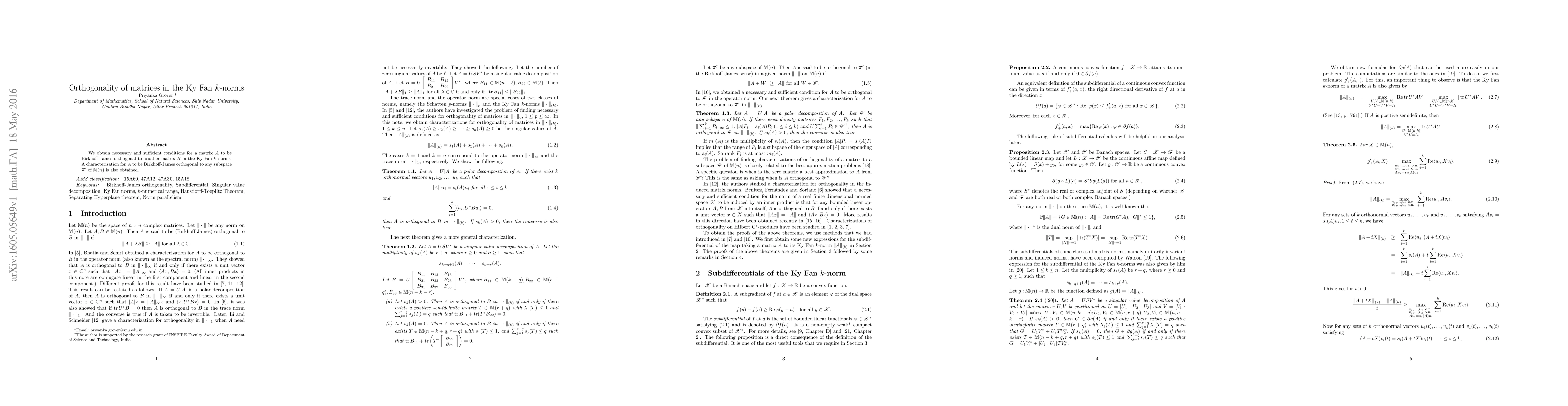 We obtain necessary and sufficient conditions for a matrix $A$ to be Birkhoff-James orthogonal to another matrix $B$ in the Ky Fan $k$-norms. A characterization for $A$ to be Birkhoff-James orthogonal to any subspace $\mathscr W$ of $\mathbb M(n)$ is also obtained.