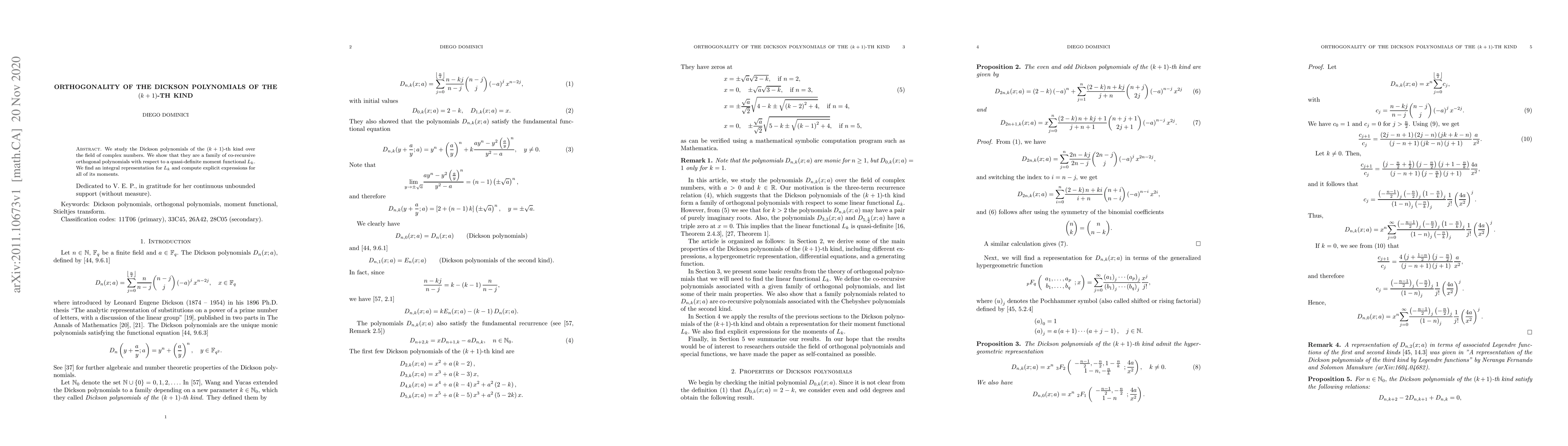 Research shows that Dickson polynomials of the (k+1)-th kind over complex numbers form a family of orthogonal polynomials with respect to a quasi-definite moment functional, providing an integral representation and explicit expressions for its moments.