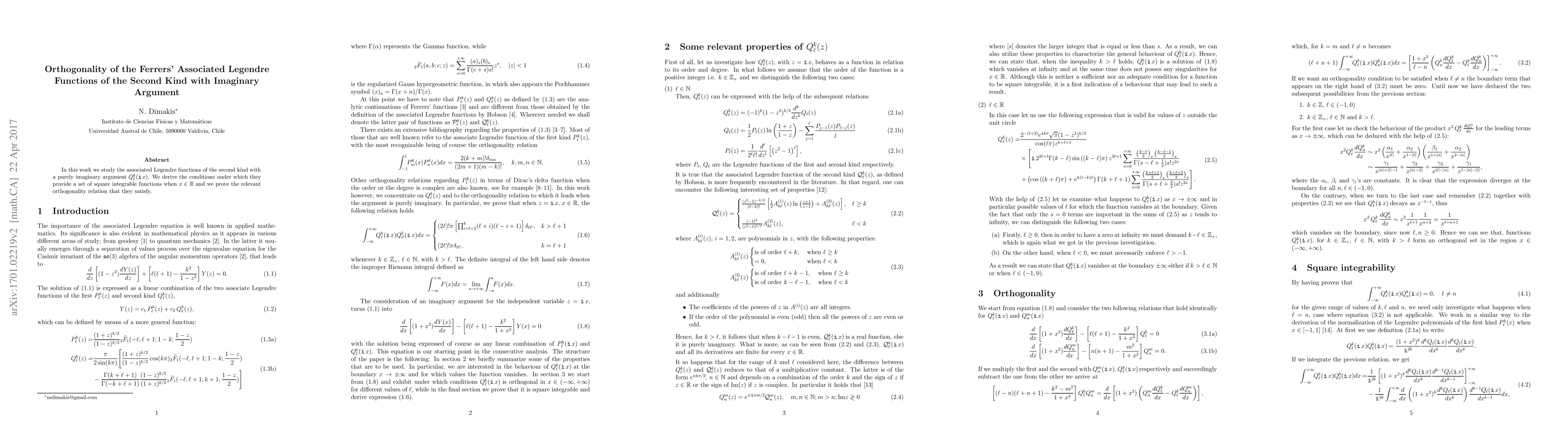 This paper investigates the associated Legendre functions of the second kind with an imaginary argument, establishing conditions for their square integrability and proving their orthogonality relations.