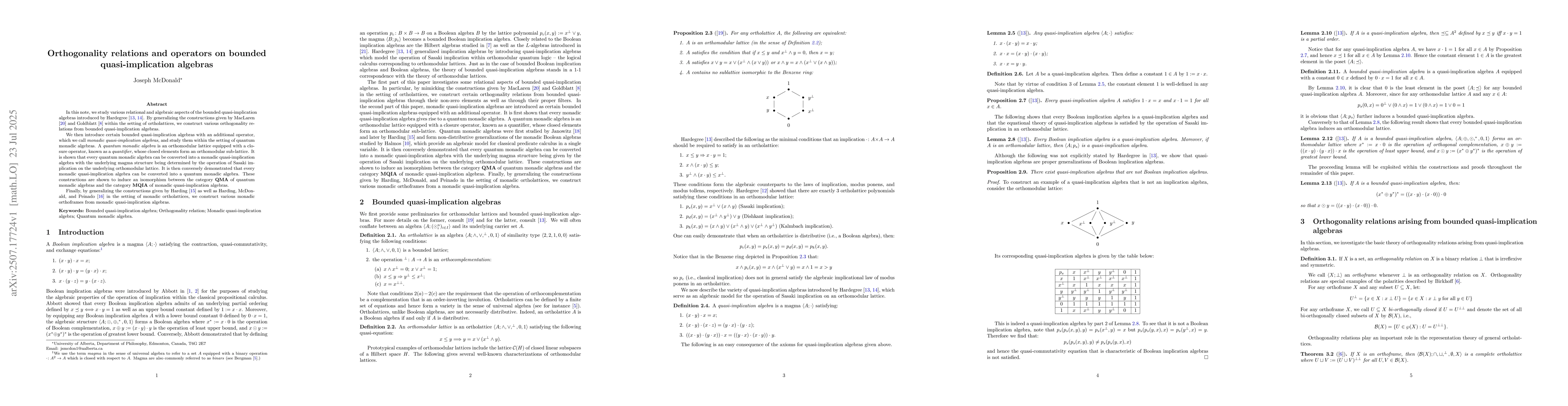 In this note, we study various relational and algebraic aspects of the bounded quasi-implication algebras introduced by Hardegree. By generalizing the constructions given by MacLaren and Goldblatt within the setting of ortholattices, we construct various orthogonality relations from bounded quasi-implication algebras. We then introduce certain bounded quasi-implication algebras with an additional operator, which we call monadic quasi-implication algebras, and study them within the setting of quantum monadic algebras. A quantum monadic algebra is an orthomodular lattice equipped with a closure operator, known as a quantifier, whose closed elements form an orthomodular sub-lattice. It is shown that every quantum monadic algebra can be converted into a monadic quasi-implication algebra with the underlying magma structure being determined by the operation of Sasaki implication on the underlying orthomodular lattice. It is then conversely demonstrated that every monadic quasi-implication algebra can be converted into a quantum monadic algebra. These constructions are shown to induce an isomorphism between the category of quantum monadic algebras and the category of monadic quasi-implication algebras. Finally, by generalizing the constructions given by Harding as well as Harding, McDonald, and Peinado in the setting of monadic ortholattices, we construct various monadic orthoframes from monadic quasi-implication algebras.