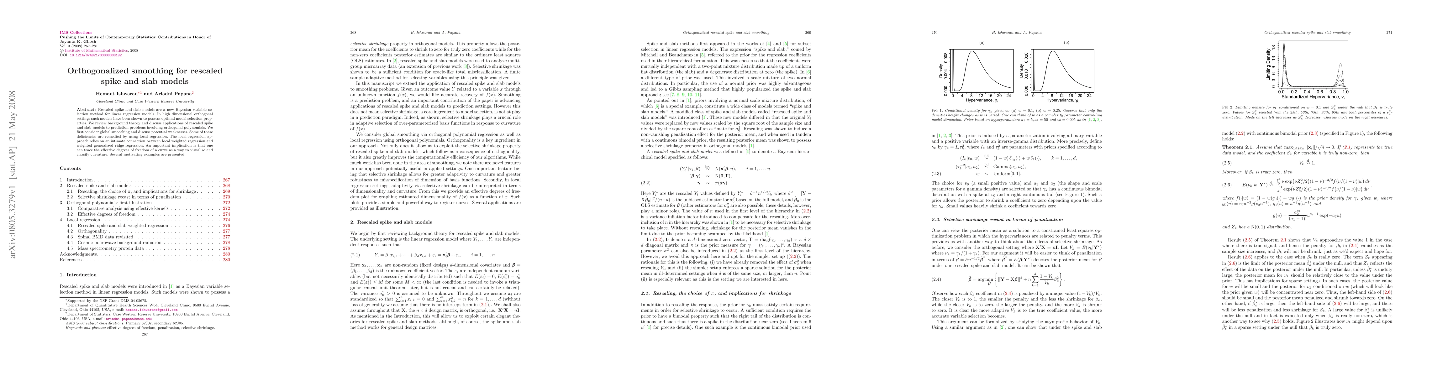 Rescaled spike and slab models are a new Bayesian variable selection method for linear regression models. In high dimensional orthogonal settings such models have been shown to possess optimal model selection properties. We review background theory and discuss applications of rescaled spike and slab models to prediction problems involving orthogonal polynomials. We first consider global smoothing and discuss potential weaknesses. Some of these deficiencies are remedied by using local regression. The local regression approach relies on an intimate connection between local weighted regression and weighted generalized ridge regression. An important implication is that one can trace the effective degrees of freedom of a curve as a way to visualize and classify curvature. Several motivating examples are presented.