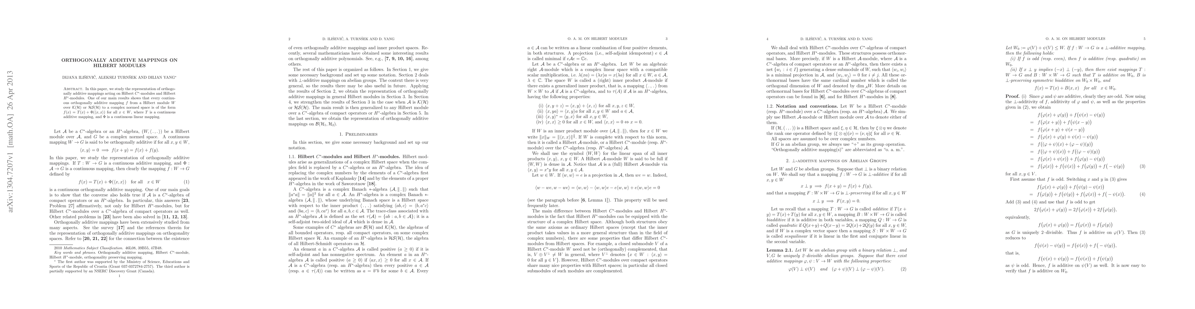 This paper explores orthogonally additive mappings on Hilbert $C^*$-modules and Hilbert $H^*$-modules, proving that any continuous orthogonally additive mapping from a Hilbert module to a complex normed space is expressible as $f(x)=T(x)+\Phi(< x, x >)$, where $T$ is a continuous additive mapping and $\Phi$ is a continuous linear mapping.