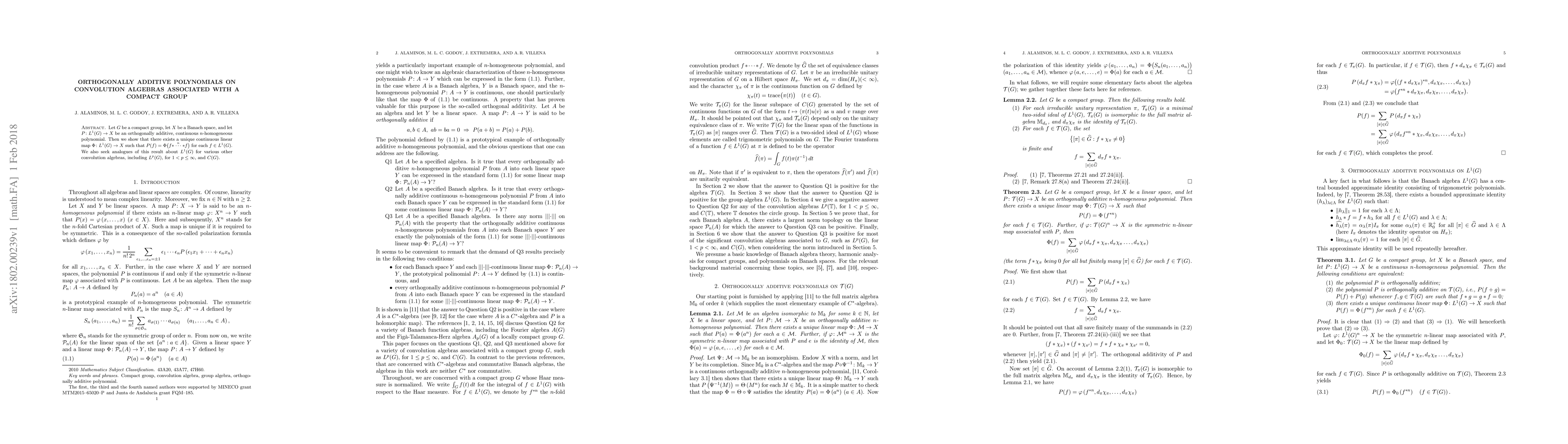 Let $G$ be a compact group, let $X$ be a Banach space, and let $P\colon L^1(G)\to X$ be an orthogonally additive, continuous $n$-homogeneous polynomial. Then we show that there exists a unique continuous linear map $\Phi\colon L^1(G)\to X$ such that $P(f)=\Phi \bigl(f\ast\stackrel{n}{\cdots}\ast f \bigr)$ for each $f\in L^1(G)$. We also seek analogues of this result about $L^1(G)$ for various other convolution algebras, including $L^p(G)$, for $1< p\le\infty$, and $C(G)$.