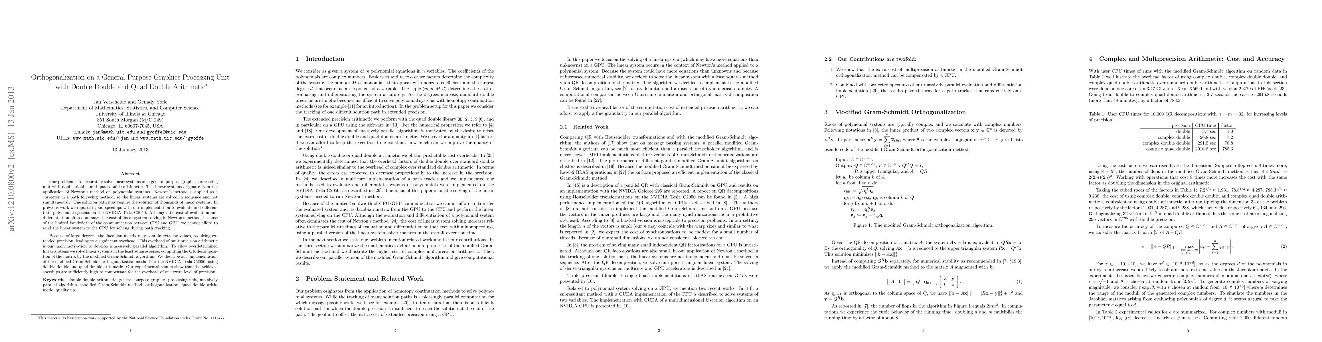 This paper proposes a massively parallel algorithm for solving linear systems on a GPU using double double and quad double arithmetic to address the challenges of extended precision in Jacobian matrices derived from Newton's method. The modified Gram-Schmidt orthogonalization method is implemented on the NVIDIA Tesla C2050, demonstrating significant speedups despite the overhead of higher precision arithmetic.