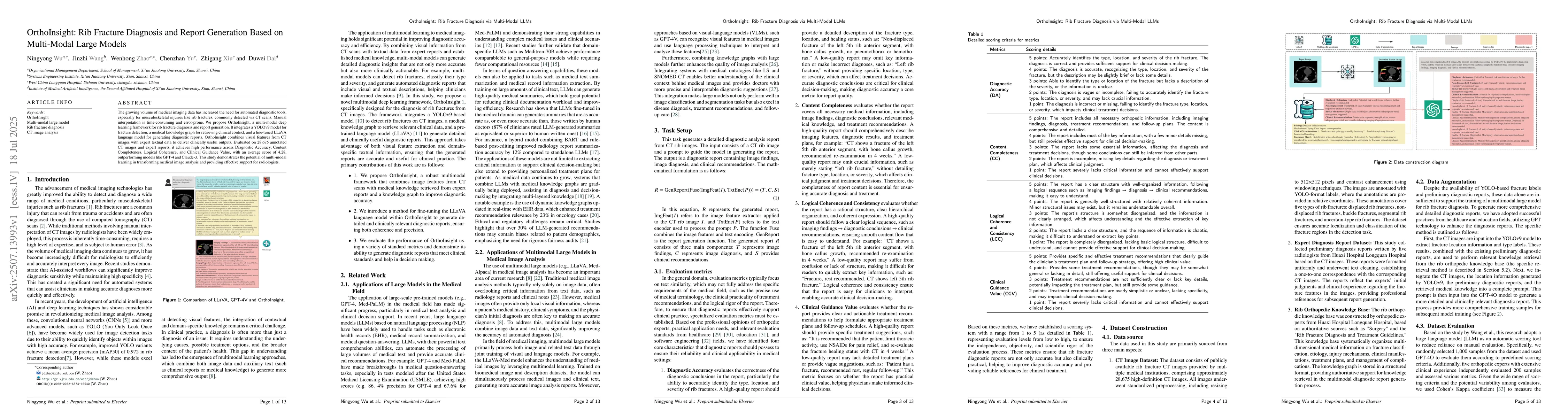The growing volume of medical imaging data has increased the need for automated diagnostic tools, especially for musculoskeletal injuries like rib fractures, commonly detected via CT scans. Manual interpretation is time-consuming and error-prone. We propose OrthoInsight, a multi-modal deep learning framework for rib fracture diagnosis and report generation. It integrates a YOLOv9 model for fracture detection, a medical knowledge graph for retrieving clinical context, and a fine-tuned LLaVA language model for generating diagnostic reports. OrthoInsight combines visual features from CT images with expert textual data to deliver clinically useful outputs. Evaluated on 28,675 annotated CT images and expert reports, it achieves high performance across Diagnostic Accuracy, Content Completeness, Logical Coherence, and Clinical Guidance Value, with an average score of 4.28, outperforming models like GPT-4 and Claude-3. This study demonstrates the potential of multi-modal learning in transforming medical image analysis and providing effective support for radiologists.