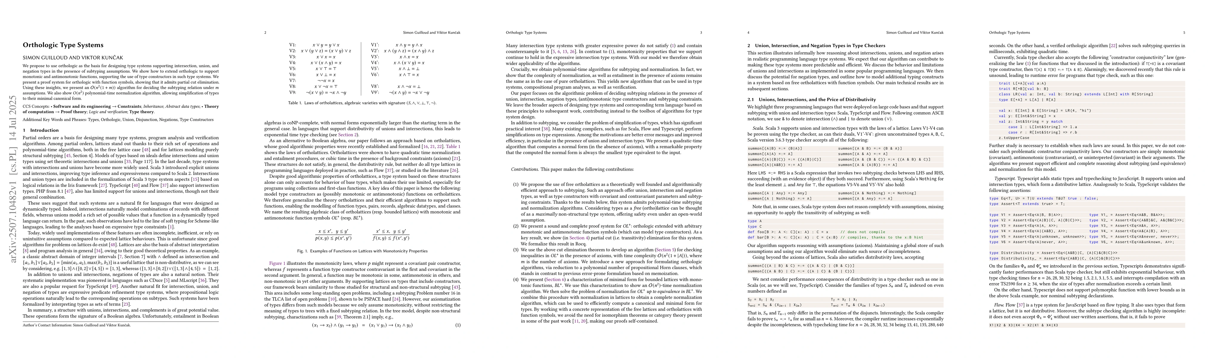 The paper introduces an extended orthologic framework with function symbols, along with efficient algorithms for subtyping and type normalization, grounded in a sound and complete proof system.
