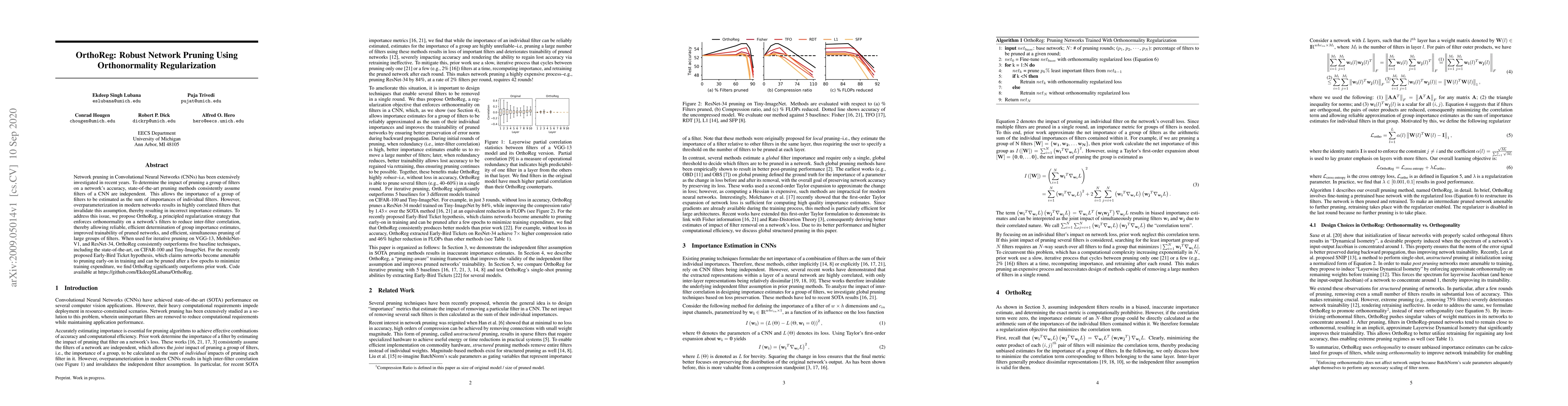 Network pruning in Convolutional Neural Networks (CNNs) has been extensively investigated in recent years. To determine the impact of pruning a group of filters on a network's accuracy, state-of-the-art pruning methods consistently assume filters of a CNN are independent. This allows the importance of a group of filters to be estimated as the sum of importances of individual filters. However, overparameterization in modern networks results in highly correlated filters that invalidate this assumption, thereby resulting in incorrect importance estimates. To address this issue, we propose OrthoReg, a principled regularization strategy that enforces orthonormality on a network's filters to reduce inter-filter correlation, thereby allowing reliable, efficient determination of group importance estimates, improved trainability of pruned networks, and efficient, simultaneous pruning of large groups of filters. When used for iterative pruning on VGG-13, MobileNet-V1, and ResNet-34, OrthoReg consistently outperforms five baseline techniques, including the state-of-the-art, on CIFAR-100 and Tiny-ImageNet. For the recently proposed Early-Bird Ticket hypothesis, which claims networks become amenable to pruning early-on in training and can be pruned after a few epochs to minimize training expenditure, we find OrthoReg significantly outperforms prior work. Code available at https://github.com/EkdeepSLubana/OrthoReg.