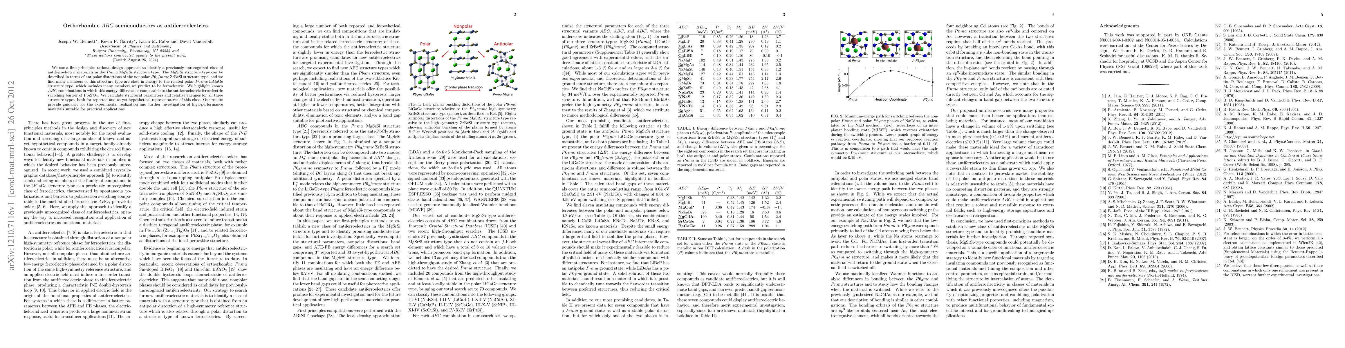 We use a first-principles rational-design approach to identify a previously-unrecognized class of antiferroelectric materials in the $Pnma$ MgSrSi structure type. The MgSrSi structure type can be described in terms of antipolar distortions of the nonpolar $P6_{3}/mmc$ ZrBeSi structure type, and we find many members of this structure type are close in energy to the related polar $P6_{3}mc$ LiGaGe structure type, which includes many members we predict to be ferroelectric. We highlight known $ABC$ combinations in which this energy difference is comparable to the antiferroelectric-ferroelectric switching barrier of PbZrO$_{3}$. We calculate structural parameters and relative energies for all three structure types, both for reported and as-yet hypothetical representatives of this class. Our results provide guidance for the experimental realization and further investigation of high-performance materials suitable for practical applications.