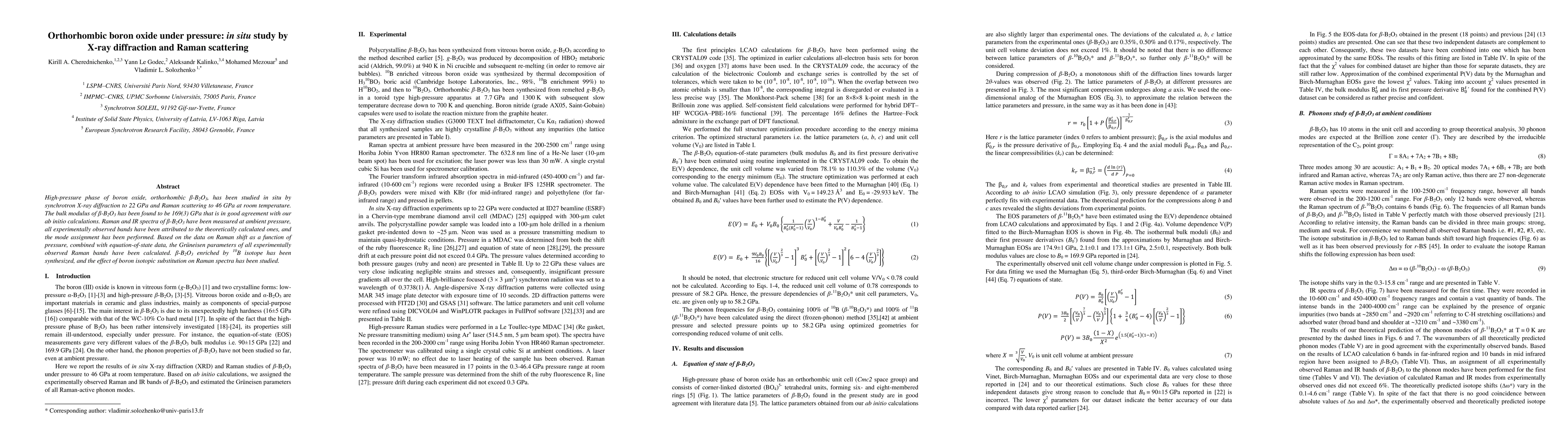 This study investigates the high-pressure behavior of orthorhombic boron oxide (\b{eta}-B2O3) using synchrotron X-ray diffraction and Raman scattering, finding a bulk modulus of 169(3) GPa and assigning Raman bands based on ab initio calculations. The effect of boron isotopic substitution on Raman spectra is also analyzed.