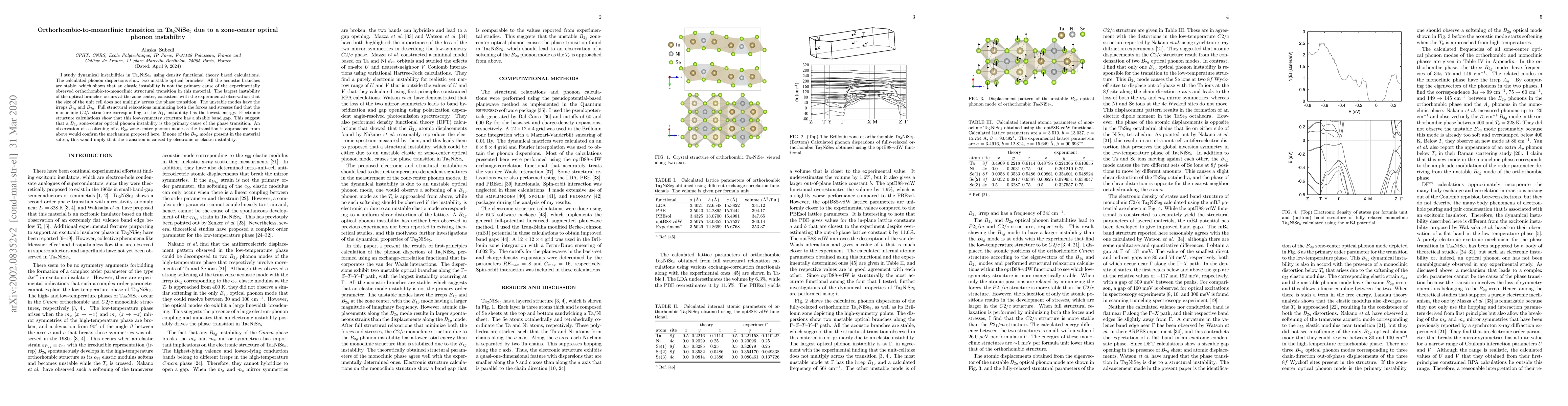 I study dynamical instabilities in Ta$_2$NiSe$_5$ using density functional theory based calculations. The calculated phonon dispersions show two unstable optical branches. All the acoustic branches are stable, which shows that an elastic instability is not the primary cause of the experimentally observed orthorhombic-to-monoclinic structural transition in this material. The largest instability of the optical branches occurs at the zone center, consistent with the experimental observation that the size of the unit cell does not multiply across the phase transition. The unstable modes have the irreps $B_{1g}$ and $B_{2g}$. Full structural relaxations minimizing both the forces and stresses find that the monoclinic $C2/c$ structure corresponding to the $B_{2g}$ instability has the lowest energy. Electronic structure calculations show that this low-symmetry structure has a sizable band gap. This suggest that a $B_{2g}$ zone-center optical phonon instability is the primary cause of the phase transition. An observation of a softening of a $B_{2g}$ zone-center phonon mode as the transition is approached from above would confirm the mechanism proposed here. If none of the $B_{2g}$ modes present in the material soften, this would imply that the transition is caused by electronic or elastic instability.