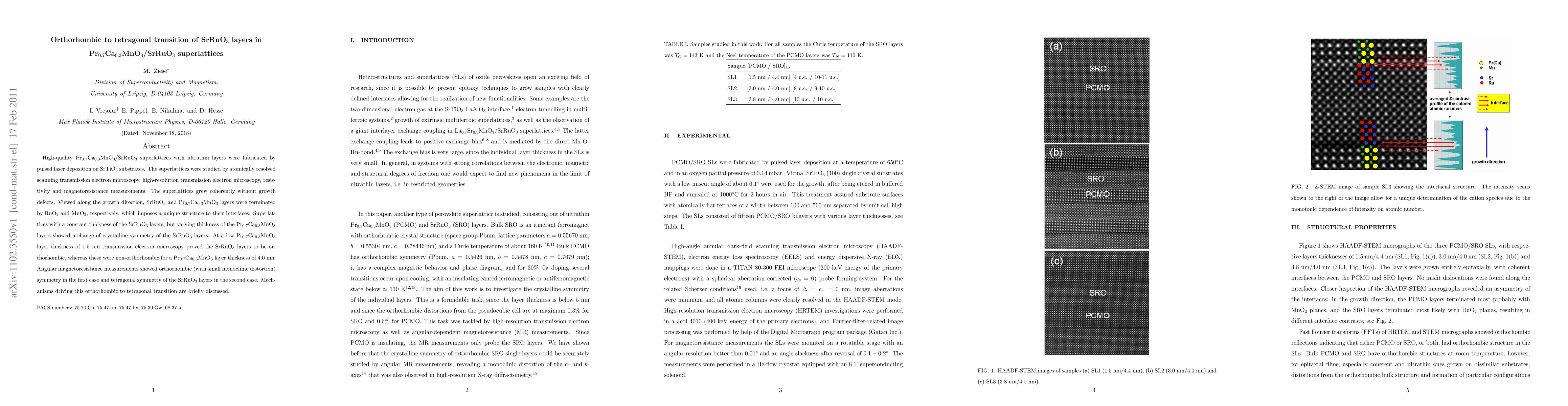 This study investigates the orthorhombic to tetragonal transition in SrRuO3 layers within Pr0.7Ca0.3MnO3/SrRuO3 superlattices fabricated by pulsed laser deposition. The SrRuO3 layers exhibit orthorhombic symmetry when the adjacent Pr0.7Ca0.3MnO3 layers are thin (1.5 nm), transitioning to tetragonal symmetry when the MnO3 layers are thicker (4.0 nm), as confirmed by electron microscopy and magnetoresistance measurements.