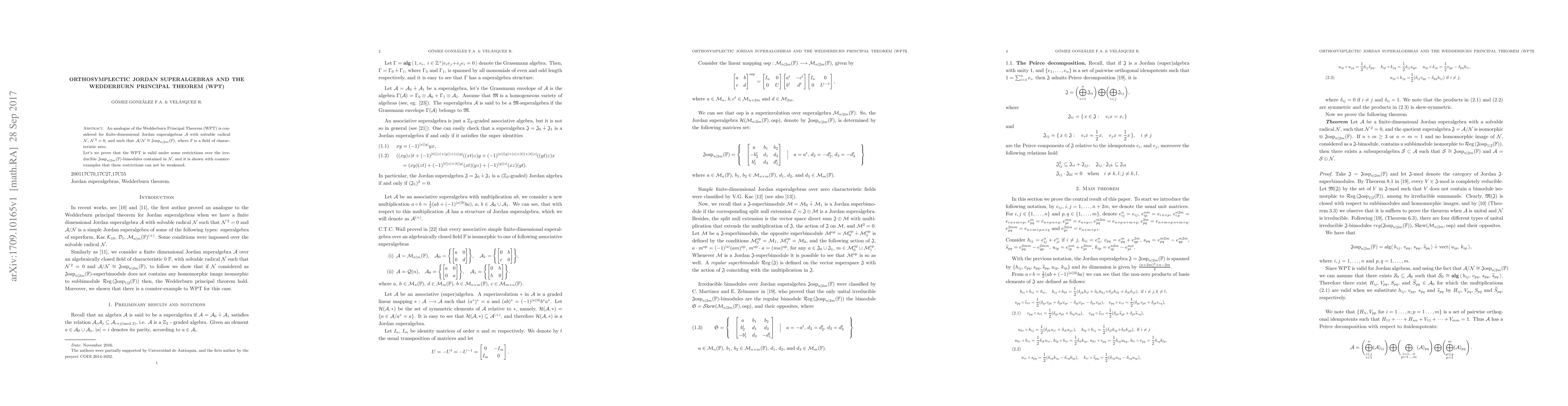 The Wedderburn principal theorem is generalized to finite-dimensional Jordan superalgebras with specific conditions, showing it holds for certain submodules but not weakened restrictions.