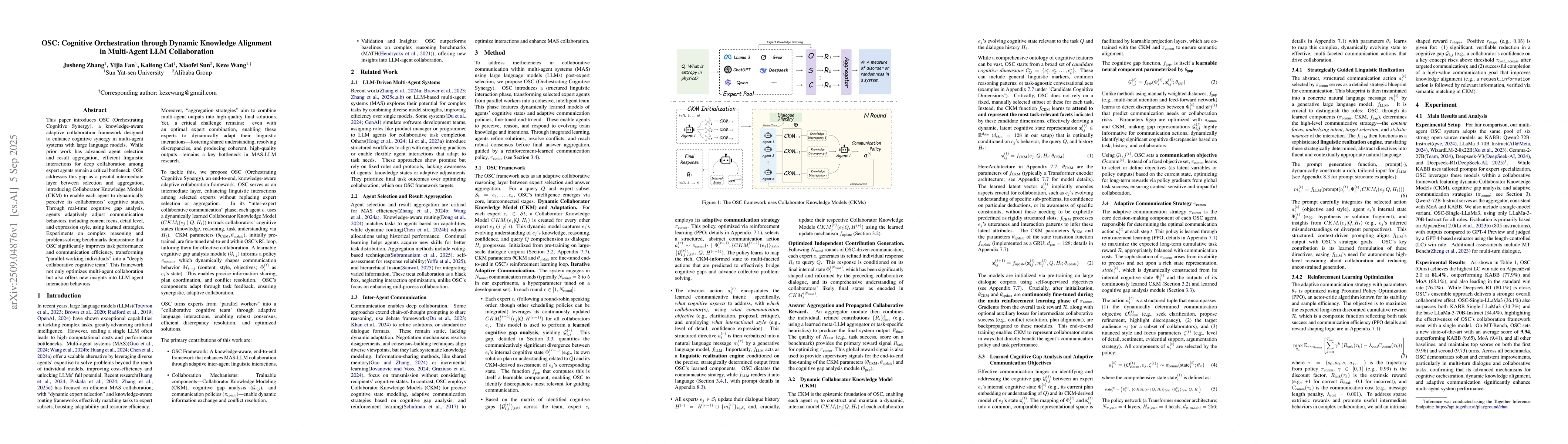 This paper introduces OSC (Orchestrating Cognitive Synergy), a knowledge-aware adaptive collaboration framework designed to enhance cognitive synergy in multi-agent systems with large language models. While prior work has advanced agent selection and result aggregation, efficient linguistic interactions for deep collaboration among expert agents remain a critical bottleneck. OSC addresses this gap as a pivotal intermediate layer between selection and aggregation, introducing Collaborator Knowledge Models (CKM) to enable each agent to dynamically perceive its collaborators' cognitive states. Through real-time cognitive gap analysis, agents adaptively adjust communication behaviors, including content focus, detail level, and expression style, using learned strategies. Experiments on complex reasoning and problem-solving benchmarks demonstrate that OSC significantly improves task performance and communication efficiency, transforming "parallel-working individuals'' into a "deeply collaborative cognitive team.'' This framework not only optimizes multi-agent collaboration but also offers new insights into LLM agent interaction behaviors.